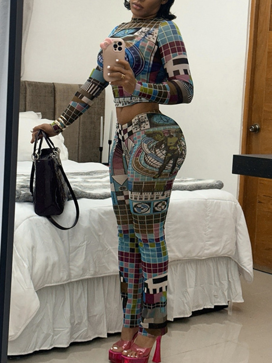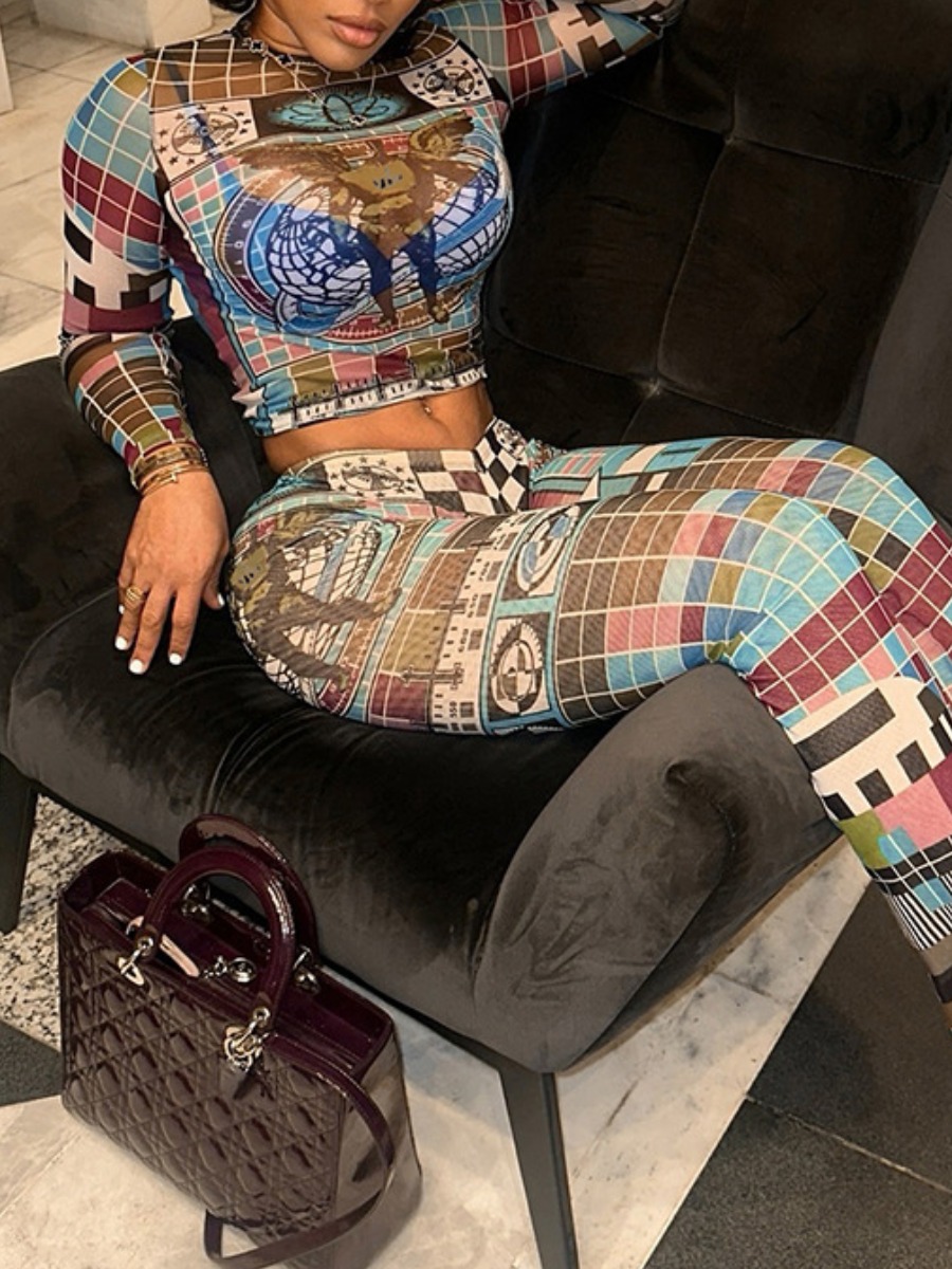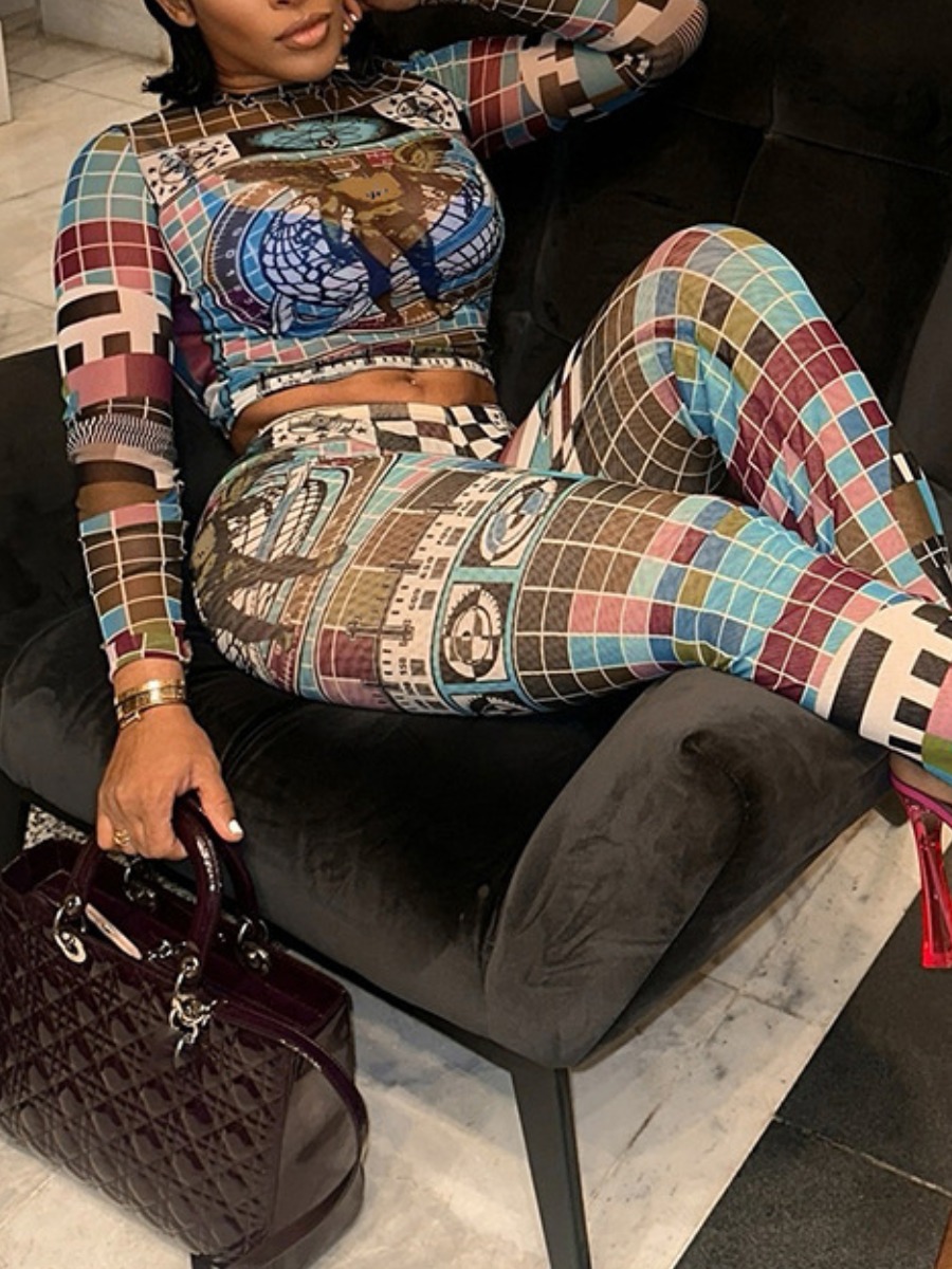 LW Street Polyester Round Neck Pattern Mixed Print Geometric Long Sleeve Two-piece Pants Set.