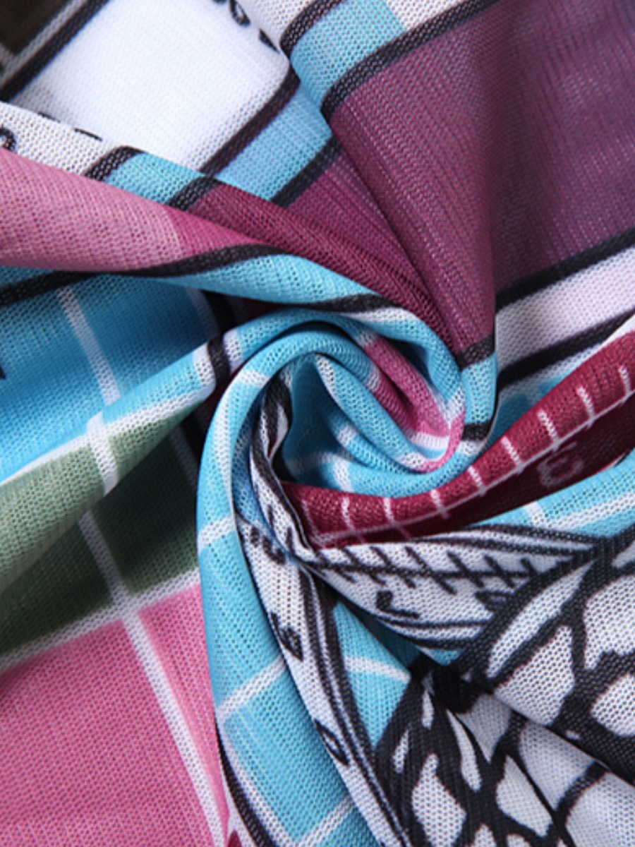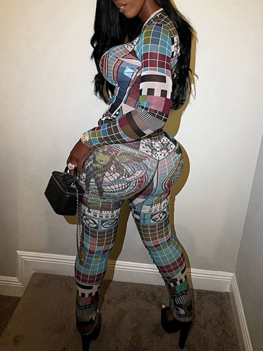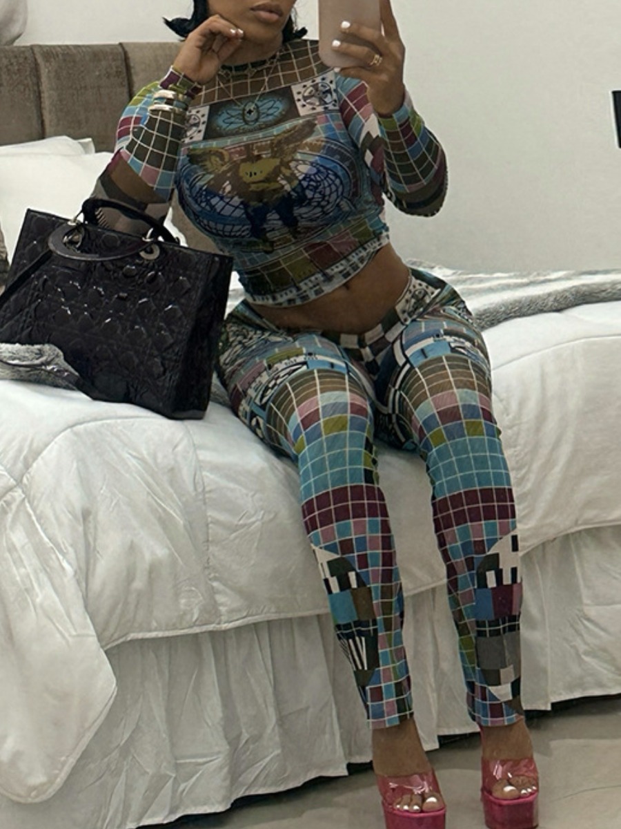 LW Street Polyester Round Neck Pattern Mixed Print Geometric Long Sleeve Two-piece Pants Set.