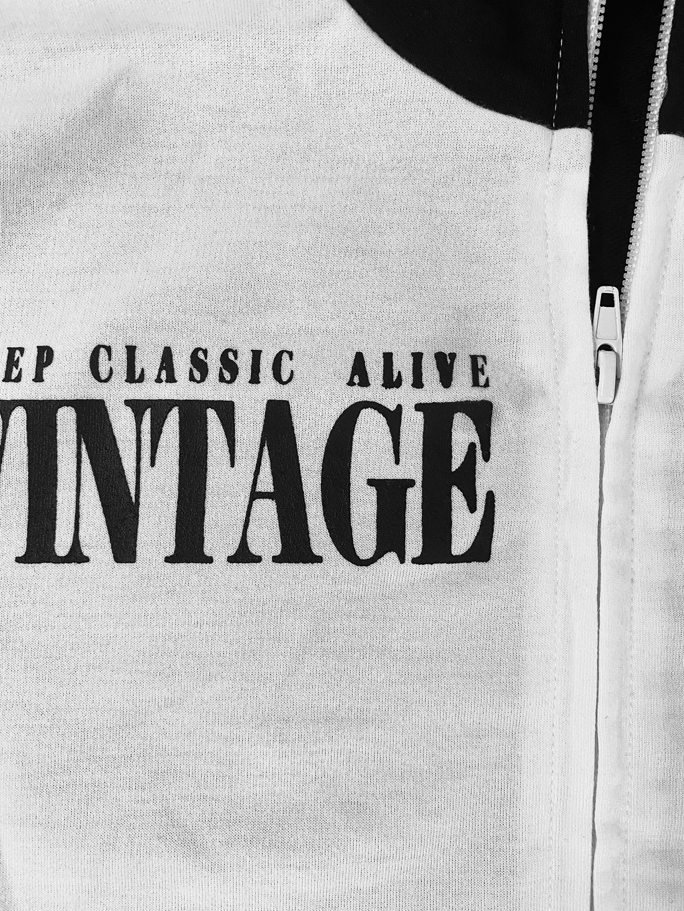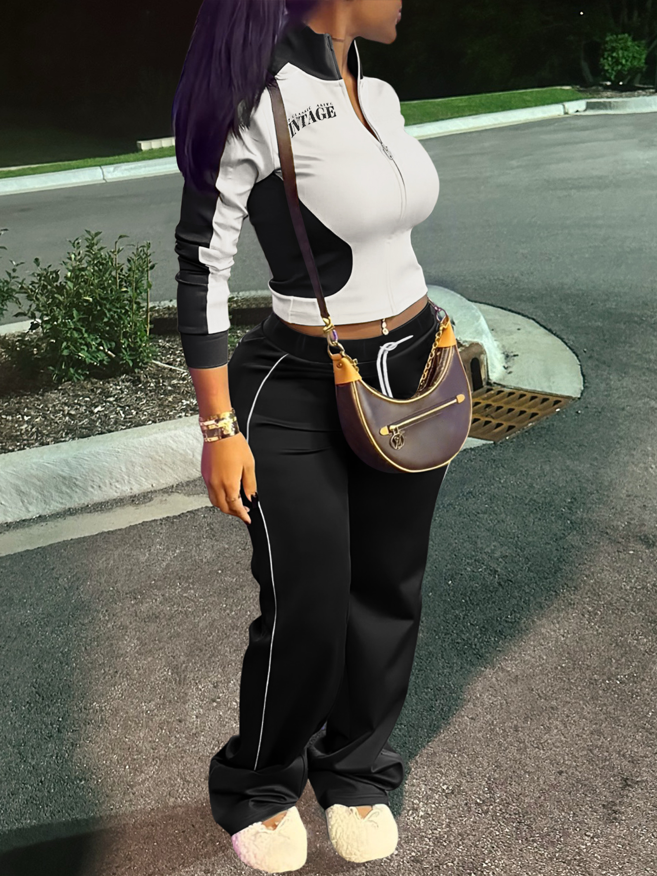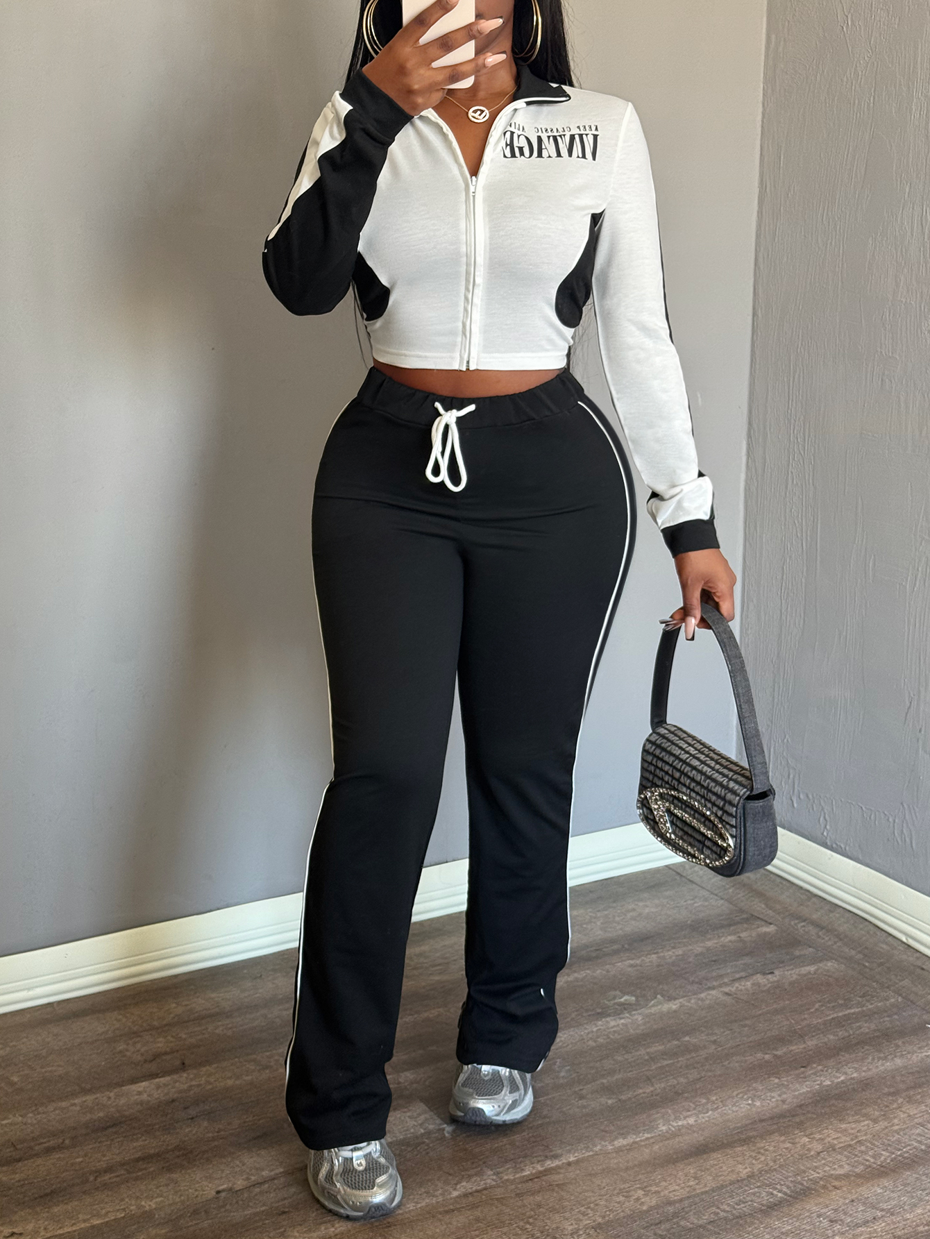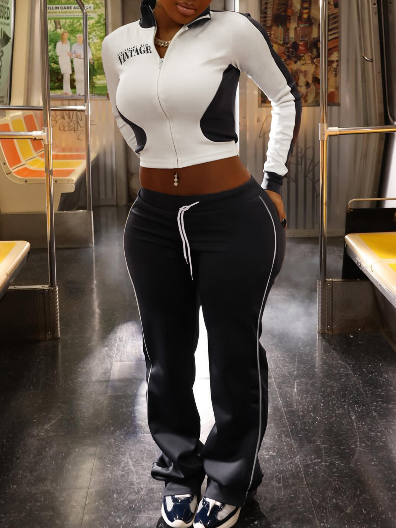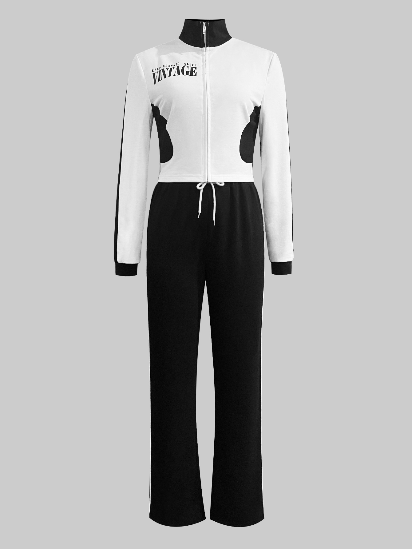 LW Casual Sweat Mandarin Collar Patchwork Letter Long Sleeve Black And White Two-piece Pants Set.