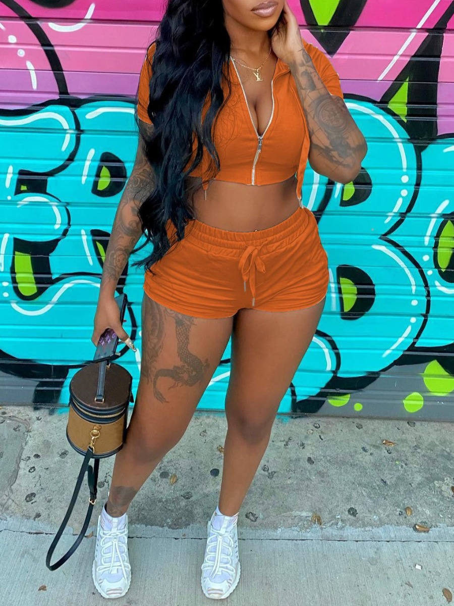LW BASICS Bandage Design Zipper Solid Color Two-piece Shorts Set.