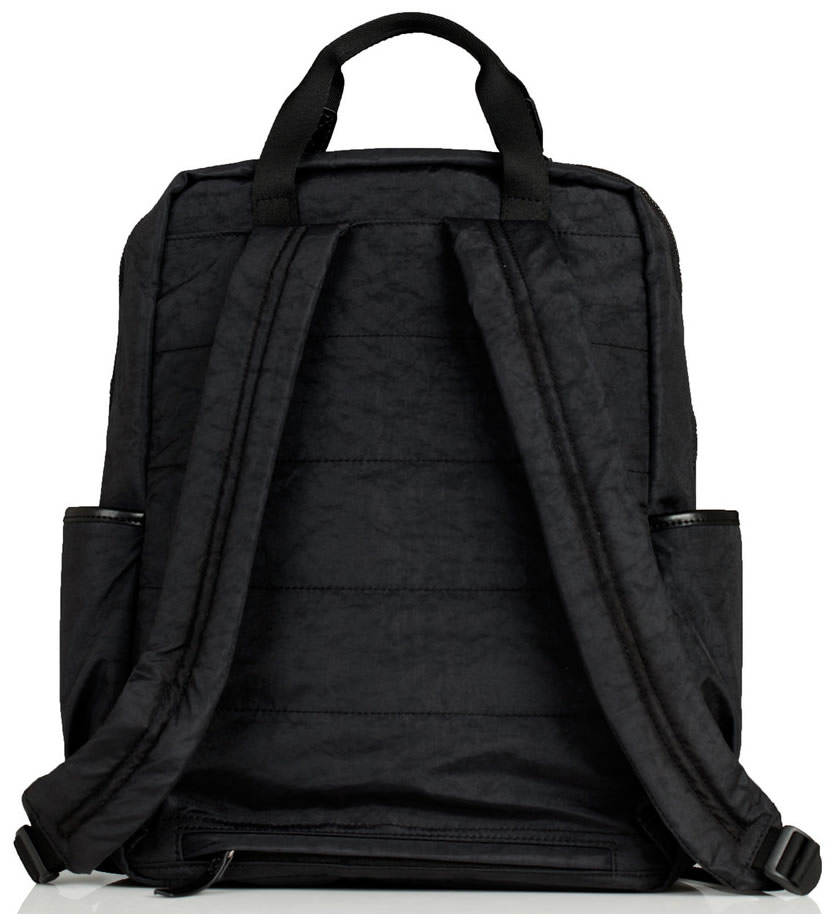 Durable, spacious and comfortable, the unisex backpack is designed for both moms and dads that are style conscious and frequently on-the-go. Our exclusive bottom hidden zipper pocket allows parents to quickly take care of dirty diapers and clothes. The interior padded tech sleeve provides protection for all handheld gadgets and up to a 14" laptop. Durable water-resistant crinkle nylon with sheep leather trim.; Two large front zipper pockets, and two insulated side bottle pockets.; Padded shoulder straps with adjustable roller. Cotton webbing top handle straps.; Entire back panel is padded for back comfort.; Hidden zipper pocket on bottom of back side for dirty item quick storage.; Large top zipper closure for easy access.; Logo interior lining is coated with PVC-free water-resistant coating.; Two interior elastic top slip pockets for bottles, diapers or wipes.; Interior laptop padded tech sleeve for all gadget protection. Fits an iPad and 14" laptop.; Interior zipper pocket.; Comes with logo lining nylon changing pad.; Free of harsh chemicals such as PVC, BPA and Phthalates.; Specifications: 12.25?(L) x 16.25?(H) x 6.25?(D); Top handle strap drop: 3.5"; Shoulder strap maximum length: 33.5?;.