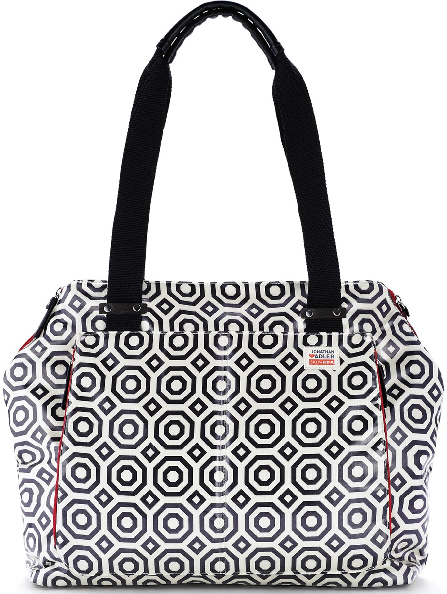 This chic lightweight tote is a diaper bag in disguise. Designer Jonathan Adler and Skip Hop have collaborated to bring you a bag that?s both functional and fabulous. It?s the perfect carry-all with plenty of room for mom?s and baby?s stuff. It features a front pocket that doubles as an insulated bottle compartment and two top zippers that allow you to modify the silhouette, changing the look from tote to handbag.