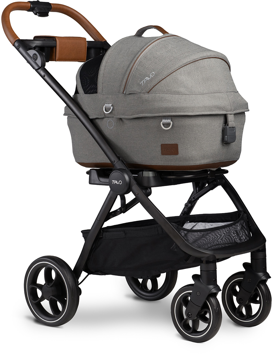 Give your life, and theirs, an upgrade. Stylish, protective, and super-portable, the Maeve 3-in-1 Pet Protection System elevates errands, amplifies adventures, and provides pets and their parents with quiet comfort and peace of mind. Tavo's Maeve Pet Protection System comes with a cozy bed and carrier that connects quickly to the included vehicle base with stability leg and to our premium Roscoe stroller frame-taking your pet's adventures inside and outside the vehicle to the next level. So, whatever the species, age, or stage of your sweet sidekick, we have you covered. Now you can unleash all that love. It's the game-changing pet protection system you never knew you needed but your pet did all along. It's together time upgraded. Your pet will thank you for it. Features Includes Maeve Flex Pet Car Seat, Vehicle Base & Roscoe Stroller Frame Maeve Flex Pet Car Seat Suitable for a pet up to 20 lbs.; Flexible top-carry handle wrapped in luxe vegan leather.; Detachable shoulder cross strap with vegan leather pad for convenient carry options.; Expertly engineered for safety Lightweight yet durable EPP foam surrounds your pet, absorbs energy, and disperses impact.; A unique guard featuring Tailor tech memory foam that absorbs energy and offers Side Impact Protection (SIP) secures easily onto the carrier frame.; MagneTech secure snap buckles quickly secure the canopy and provide frustration free access.; Your pet's ultimate comfort zone Designed to provide a home-away-from-home which can reduce anxiety.; Spacious pod and structural canopy create a cozy area that your pet will look forward to curling up in.; Flexible mesh ventilation panels on canopy allow for airflow and a view to the world for your pet.; Peek-a-boo window_for checking in and seeing out.; Canopy opens on either side and is easily removed for the ultimate customized space.; Mindfully curated premium materials Our fabrics are naturally flame-resistant, free of harmful fire-retardant chemicals, making them safer for your pet._; Canopy fabric is UPF 50+, the maximum sun protective rating achievable for fabrics.; Includes two liner and mattress cover sets that easily zip on and off and are machine washable, air dry.; One standard set - A durable fabric that matches the exterior color of your carrier.; One comfort set - A plush material treated with an eco-friendly, zinc-based technology that provides antimicrobial protection and guards against odor causing bacteria.; Includes two padded mattresses which are easy to rinse and wipe clean.; Premium vegan leather accents for a luxe touch.; Thoughtfully designed details Rubberized feet minimize movement as your pet jumps in and out at home.; 2 leashes of different lengths to keep your pet connected when strolling with an open canopy.; High-strength alloy leash attachments available on both sides of the carrier interior.; Converts simply to a stroller with the included Roscoe pet stroller frame.; Maeve Base Five-second True lock installation; Base attaches to the vehicle's rigid latch anchor bars for a secure, simple installation.; Colored indicators turn green to provide clear confirmation when locked into the vehicle seat.; Stability leg adjusts to the height of your vehicle seats, and an indicator turns green when properly engaged.; Engineered for Safety An energy-absorbing load leg extends from the front of the base to the vehicle floor.; In the event of impact, the stability leg decreases rotation and reduces movement of the carrier.; How to Use Maeve simply clicks down onto the base, and colored indicators confirm a locked connection.; Easily adjustable base positioning adapts to the depth of your vehicle seats.; A smartly located carrier release button makes for easy transfer from car to stroller or home.; Roscoe Stroller Frame Ultimate smooth maneuverability; Multi-terrain suspension accommodates bumps wherever your stroll takes you.; Expertly engineered frame is strong and stable around every bend in the road.; Puncture-proof, lightweight EVA tires provide a softer ride.; Front-wheel swivel-lock for easier navigation over rough paths.; One-touch braking system with a top tap saves your shoes and toes.; One-hand, self-collapsing compact fold With the touch of a button on the pushbar, the frame easily folds down into a compact package.; Convenient built-in rigid carry handle for easy transporting when folded.; Stands when folded for free hands and easy storage.; A place for everything Built-in organizer on the pushbar includes cup holder, phone slot, and compartment with secure magnetic closure to keep everything from your keys to their treats in reach during the journey.; A strong and roomy bottom basket holds up to 10 lbs.; Mindfully curated premium materials Durable matte-black frame is lightweight and thoughtfully designed with sleek lines.; Premium vegan leather detailing pro.