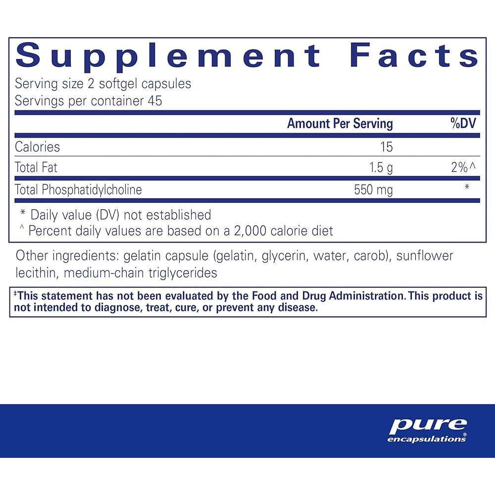 Pure Encapsulations Phosphatidylcholine provides a key component of cell membranes and supports healthy liver function cognitive health and fat metabolism. Derived from sunflower lecithin this formula offers a bioavailable source of phosphatidylcholine which helps maintain cell membrane integrity supports brain health and aids in the emulsification of fats for efficient digestion. Benefits: Cell Membrane Health: Supports the structure and function of healthy cell membranes for optimal cellular communication. Liver Function: Promotes healthy liver function and aids in detoxification processes. Cognitive Support: Helps maintain cognitive health by supporting neurotransmitter production and brain cell communication. How to Use: Take 12 softgel capsules daily with meals or as directed by your healthcare professional.
