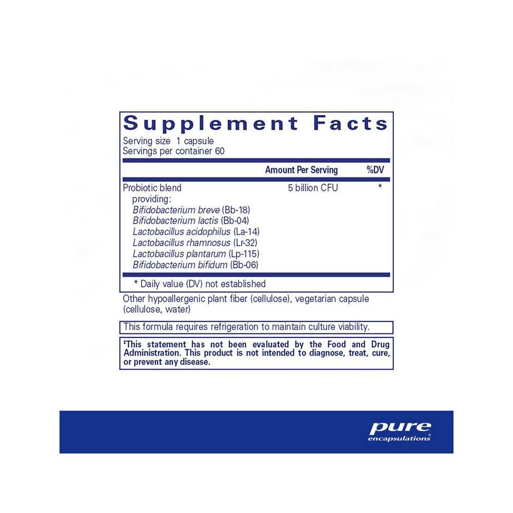 Pure Encapsulations PureProbiotic provides a balanced mix of beneficial probiotic strains to support digestive health and immune function. This formula is designed to help maintain a healthy balance of gut bacteria which plays a crucial role in digestion nutrient absorption and overall wellness. Its an ideal supplement for promoting gastrointestinal comfort and enhancing immune health. Benefits: Supports Digestive Health: Promotes a healthy gut microbiome and aids in digestion and nutrient absorption. Enhances Immune Function: Helps maintain a balanced immune response by supporting gut health. Gentle & Effective: A carefully selected blend of probiotic strains for everyday support of digestive and immune health. How to Use: Take 1 capsule daily with or without meals or as directed by your healthcare practitioner.
