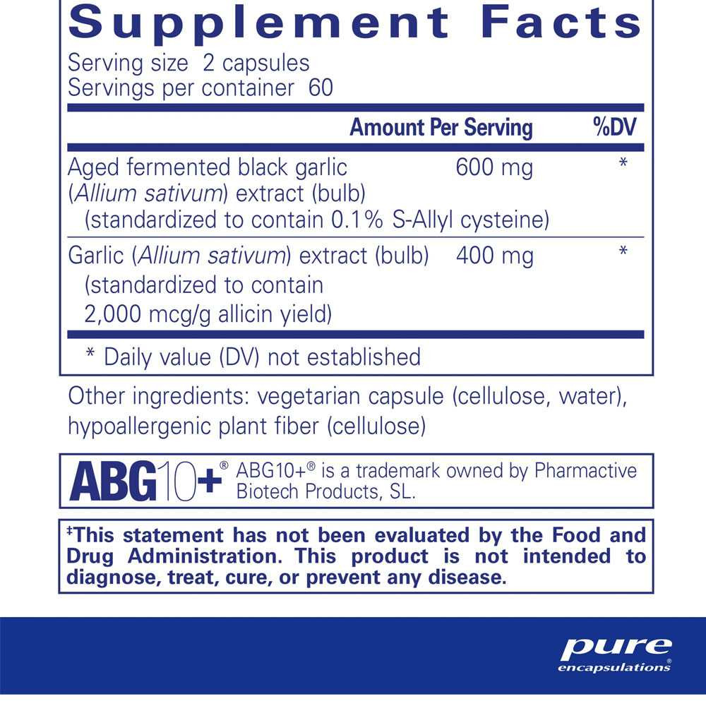 Pure Encapsulations Garlic Complex provides a comprehensive blend of garlic and complementary herbs to support cardiovascular health immune function and antioxidant defense. Formulated with aged garlic extract and additional botanicals such as hawthorn and olive leaf this complex helps maintain healthy blood pressure levels promotes circulation and supports overall cardiovascular function. Benefits: Cardiovascular Support: Helps maintain healthy blood pressure and promotes optimal heart function. Immune Health: Garlic and herbal extracts support a healthy immune response. Antioxidant Protection: Provides potent antioxidants that help protect cells from oxidative stress and support overall health. How to Use: Take 2 capsules daily with meals or as directed by your healthcare practitioner.