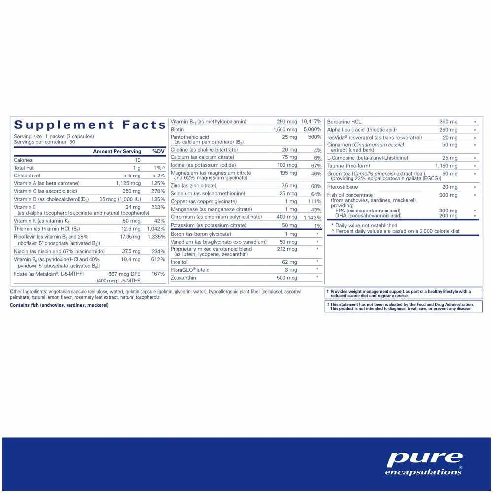 Pure Encapsulations PureLean Pure Pack offers a comprehensive daily supplement regimen designed to support weight management metabolic health and overall wellness. Each packet contains a blend of vitamins minerals antioxidants and metabolism-supporting nutrients tailored to promote healthy body composition and support metabolic function. Benefits: Weight Management : Supports healthy weight management by promoting fat metabolism and lean muscle maintenance. Metabolic Health : Enhances metabolic function and helps balance blood sugar levels. Nutritional Support : Provides essential vitamins minerals and antioxidants to support overall well-being and daily nutritional needs. How to Use: Take 1 packet daily with a meal or as directed by your healthcare provider. Each packet contains a combination of capsules and softgels to be taken together.