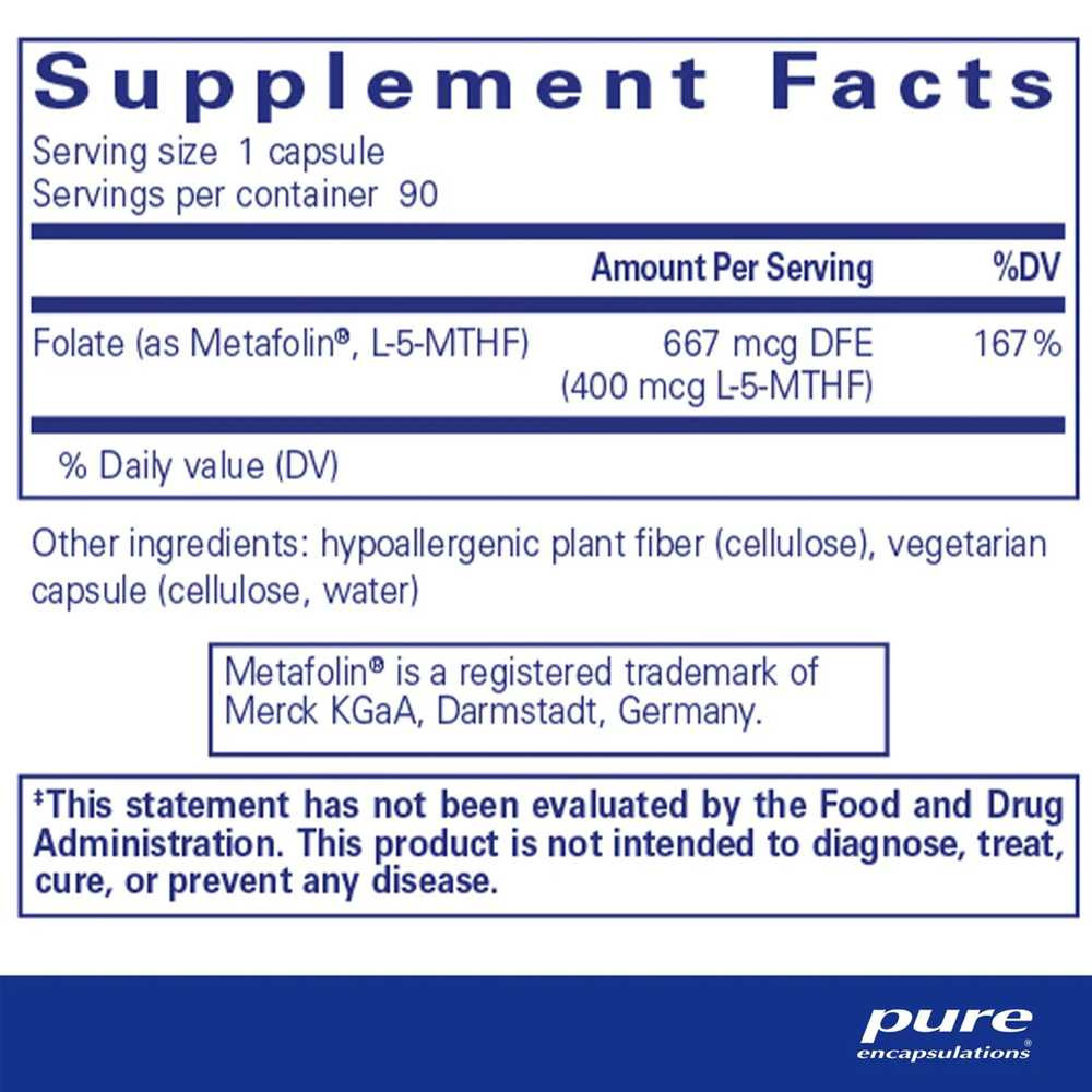 Pure Encapsulations Folate 400 provides a highly bioavailable form of folate an essential B-vitamin that supports healthy cellular function cardiovascular health and nervous system function. Folate is crucial for DNA synthesis methylation processes and overall well-being. Benefits: Supports cardiovascular health by promoting healthy homocysteine levels. Aids in DNA synthesis and supports cellular health and function. Promotes nervous system health and cognitive function. How to Use: Take 1 capsule daily with a meal or as directed by a healthcare professional.