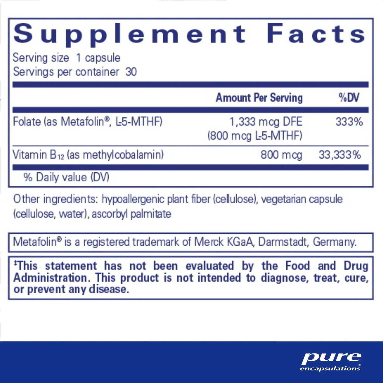 Pure Encapsulations B12 Folate combines methylated forms of vitamins B12 and folate to support cardiovascular health cognitive function and overall cellular energy. These essential B vitamins help promote healthy homocysteine levels and support nervous system health. Benefits: Supports cardiovascular health by promoting healthy homocysteine levels. Enhances cognitive function and mental clarity by supporting nervous system health. Promotes cellular energy production through essential B vitamins. How to Use: Take 1 capsule daily with a meal or as directed by a healthcare professional.