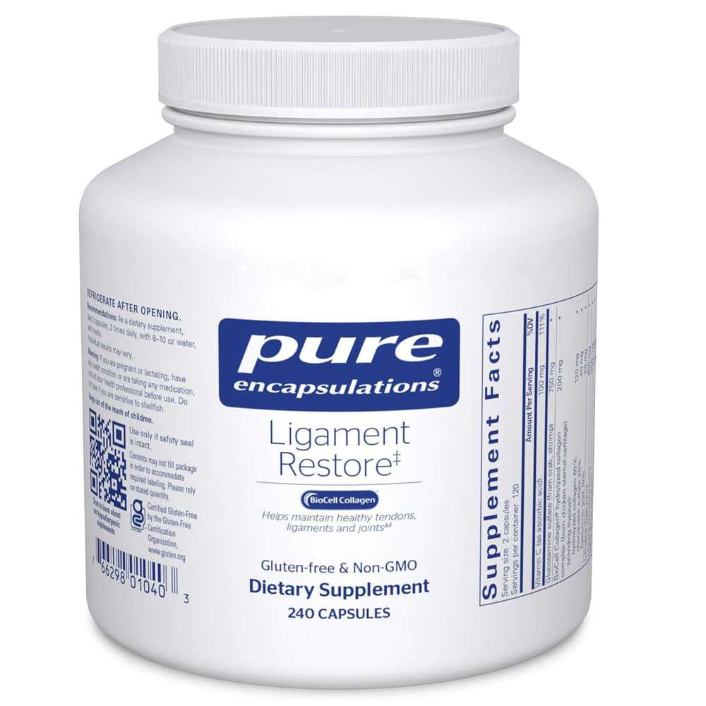 Immerse yourself in a healthier lifestyle with the help of Pure Encapsulations Ligament Restore. This remarkable dietary supplement is specifically engineered to reinforce ligament health and elasticity. Beyond its primary role it also serves as a wonderful adjunct to the maintenance of joint and bone health. Experience the power of nature's bounty in supporting your body's overall health and strength. Benefits: Ligament Health: Specifically designed to support and promote the overall health and elasticity of ligaments. Joint and Bone Health: Provides supplemental support to the maintenance of healthy joints and bones. Natural Ingredients: Crafted from pure high-quality natural ingredients that your body deserves. Overall Wellness: Contributes to overall physical wellness by supporting the most fundamental structures in your body. How to Use: Dosage: For optimal results take two capsules daily between meals or as directed by your healthcare professional. Storage: Keep this supplement stored in a cool dry place away from direct sunlight. This product should be kept out of the reach of children. Precautions: Consult a healthcare professional before using this product especially if you are pregnant nursing taking medication or have a medical condition. Do not exceed the recommended dosage.