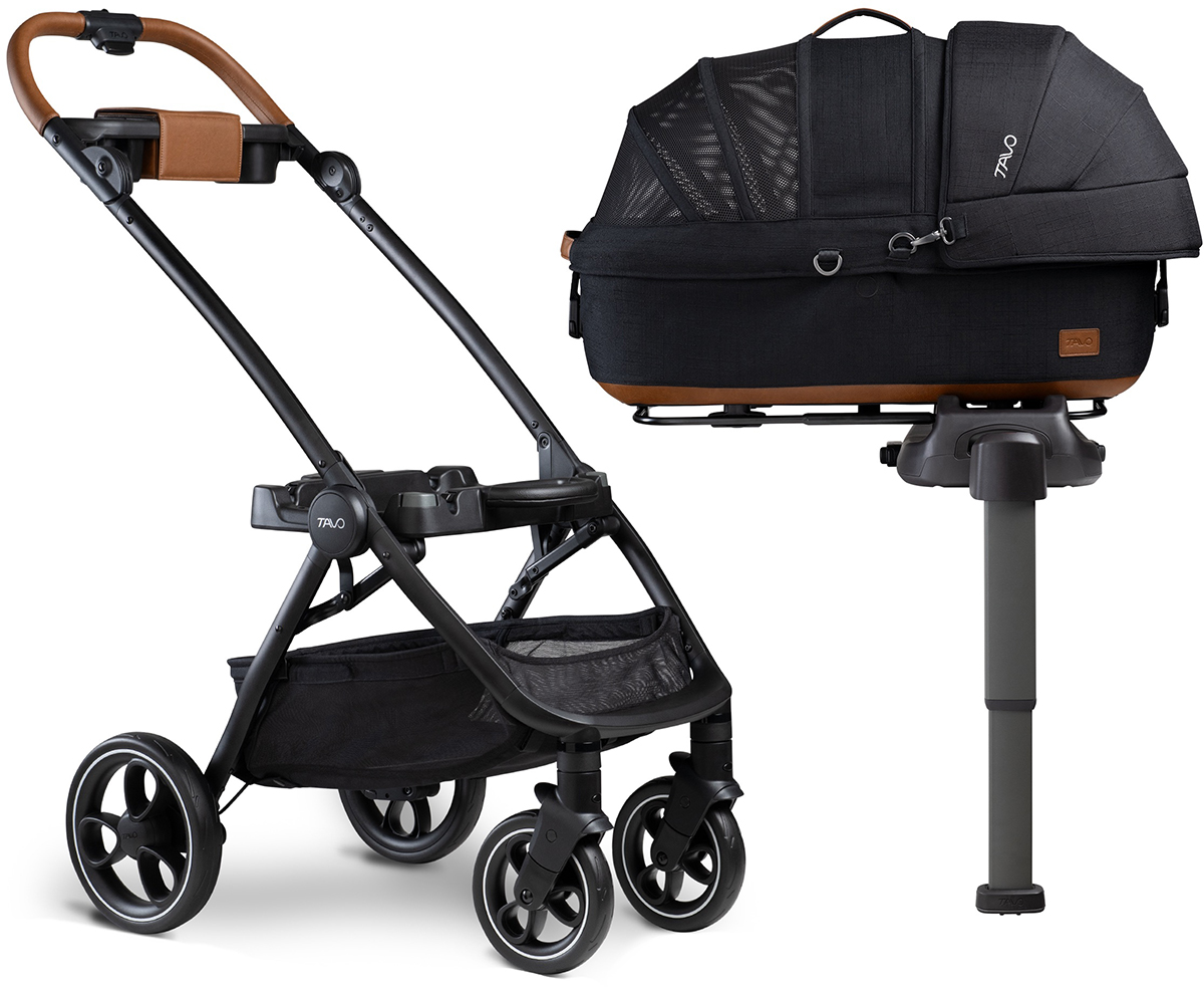 Give your life, and theirs, an upgrade. Stylish, protective, and super-portable, the Maeve 3-in-1 Pet Protection System elevates errands, amplifies adventures, and provides pets and their parents with quiet comfort and peace of mind. Tavo's Maeve Pet Protection System comes with a cozy bed and carrier that connects quickly to the included vehicle base with stability leg and to our premium Roscoe stroller frame-taking your pet's adventures inside and outside the vehicle to the next level. So, whatever the species, age, or stage of your sweet sidekick, we have you covered. Now you can unleash all that love. It's the game-changing pet protection system you never knew you needed but your pet did all along. It's together time upgraded. Your pet will thank you for it. Features Includes Maeve Flex Pet Car Seat, Vehicle Base & Roscoe Stroller Frame Maeve Flex Pet Car Seat Suitable for a pet up to 25 lbs.; Flexible top-carry handle wrapped in luxe vegan leather.; Exterior zippered pocket_for on-the-go essentials.; Expertly engineered for safety Lightweight yet durable EPP foam surrounds your pet, absorbs energy, and disperses impact.; A unique guard featuring Tailor tech memory foam that absorbs energy and offers Side Impact Protection (SIP) secures easily onto the carrier frame.; MagneTech secure snap buckles quickly secure the canopy and provide frustration free access.; Your pet's ultimate comfort zone Designed to provide a home-away-from-home which can reduce anxiety.; Spacious pod and structural canopy create a cozy area that your pet will look forward to curling up in.; Flexible mesh ventilation panels on canopy allow for airflow and a view to the world for your pet.; Peek-a-boo window_for checking in and seeing out.; Canopy opens on either side and is easily removed for the ultimate customized space.; Mindfully curated premium materials Our fabrics are naturally flame-resistant, free of harmful fire-retardant chemicals, making them safer for your pet._; Canopy fabric is UPF 50+, the maximum sun protective rating achievable for fabrics.; Includes two liner and mattress cover sets that easily zip on and off and are machine washable, air dry.; One standard set - A durable fabric that matches the exterior color of your carrier.; One comfort set - A plush material treated with an eco-friendly, zinc-based technology that provides antimicrobial protection and guards against odor causing bacteria.; Includes two padded mattresses which are easy to rinse and wipe clean.; Premium vegan leather accents for a luxe touch.; Thoughtfully designed details Rubberized feet minimize movement as your pet jumps in and out at home.; 2 leashes of different lengths to keep your pet connected when strolling with an open canopy.; High-strength alloy leash attachments available on both sides of the carrier interior.; Converts simply to a stroller with the included Roscoe pet stroller frame.; Maeve Base Five-second True lock installation; Base attaches to the vehicle's rigid latch anchor bars for a secure, simple installation.; Colored indicators turn green to provide clear confirmation when locked into the vehicle seat.; Stability leg adjusts to the height of your vehicle seats, and an indicator turns green when properly engaged.; Engineered for Safety An energy-absorbing load leg extends from the front of the base to the vehicle floor.; In the event of impact, the stability leg decreases rotation and reduces movement of the carrier.; How to Use Maeve simply clicks down onto the base, and colored indicators confirm a locked connection.; Easily adjustable base positioning adapts to the depth of your vehicle seats.; A smartly located carrier release button makes for easy transfer from car to stroller or home.; Roscoe Stroller Frame Ultimate smooth maneuverability; Multi-terrain suspension accommodates bumps wherever your stroll takes you.; Expertly engineered frame is strong and stable around every bend in the road.; Puncture-proof, lightweight EVA tires provide a softer ride.; Front-wheel swivel-lock for easier navigation over rough paths.; One-touch braking system with a top tap saves your shoes and toes.; One-hand, self-collapsing compact fold With the touch of a button on the pushbar, the frame easily folds down into a compact package.; Convenient built-in rigid carry handle for easy transporting when folded.; Stands when folded for free hands and easy storage.; A place for everything Built-in organizer on the pushbar includes cup holder, phone slot, and compartment with secure magnetic closure to keep everything from your keys to their treats in reach during the journey.; A strong and roomy bottom basket holds up to 10 lbs.; Mindfully curated premium materials Durable matte-black frame is lightweight and thoughtfully designed with sleek lines.; Premium vegan leather detailing provides a luxe touch for your ever.