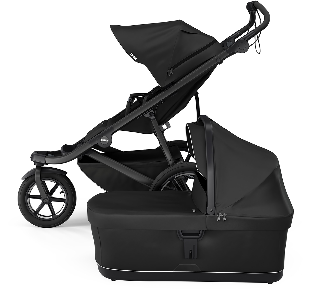 Thule Urban Glide 3 is the ultimate full-size, iconic all-terrain stroller, perfect for both newborns and toddlers. Updated with more comfort features, the built-in legrest, upright, comfortable seat with adjustable recline and full coverage canopy with ventilation makes for a comfortable ride all-day, everywhere. Designed for active parents, Thule Urban Glide 3 offers a combination of comfort, functionality, and performance on any surface. Experience unmatched maneuverability with its sleek and lightweight design, and large 16"" air-filled tires for superior suspension. Whether you're strolling through the city or conquering rough terrains, this stroller delivers a smooth and comfortable ride. The swivel front wheel effortlessly maneuvers through crowded streets and is easily locked in place when you are gearing up to a higher pace. The twist hand brake provides optimal speed control whether on pavements or hilly terrain. The Thule Urban Glide 3 is not only practical but also convenient. Its one-handed, compact fold makes storage and transportation a breeze. The spacious cargo basket with zip-top cover has plenty of room to bring what you need for your adventures. With premium features like air-filled tires for a smooth ride and a canopy with full coverage and ventilation, your child will be comfortable no matter what the day holds. Features The swivel front wheel, which locks into place for higher speeds, combined with large rear wheels, makes the stroller lightweight and easy to maneuver; Built-in legrest and comfortable seat with adjustable recline gives full child comfort all day whether taking in the sights or a nap; Integrated twist hand brake for smooth, safe speed control in any terrain; Easy, one-hand, compact fold with self-stand feature for easy storage and transportation; Large canopy with full coverage and ventilation ensures your child is comfortable; A large cargo basket with a zip-top cover, a rear mesh pocket, and two mesh compartments for snacks or toys provides ample space for everything you need; Ergonomic, adjustable handlebar for maximum parent comfort; Secure and comfortable seat with easily adjustable, padded 5-point harness; Reflective feature on canopy and wheels ensures visibility and safety; Peak-a-boo window lets you check on your sleeping child without disturbing them; Specifications Max child weight: 49 lb; Max stroller weight capacity: 75 lb; Folded dimensions: 34.6 x 22.8 x 12.2 in; Weight: 26.2 lb; Sitting height: 20 in; Door pass through: 27.2 in; Material: Aluminum frame, steel and nylon parts and polyester cover; Thule Bassinet Thule bassinet transforms your stroller into a comfortable pram in no time. It's easy to attach to your stroller with an easy click-in installation. The bassinet is ideal for infants aged 0-6 months and it and includes a bassinet apron and ventilated mattress to keep your baby comfortable. When you are done with your walk the bassinet will easily and quietly detach from the stroller. Features Spacious and comfortable bassinet, with ventilated base and mattress; Extendable and ventilated canopy gives your child a pleasant ride in any weather. The canopy provides full sun coverage and UPF 50+ UV protection; Removable and perforated mattress with machine washable cover; Soft and cozy mesh fabric on the inside for your baby's comfort, with durable water repellent rip stop fabric on the exterior; Easy grip click-in/click-out to bassinet adapters specific for your stroller model; Reflective details on both canopy rim and bassinet base for improved visibility in low light conditions; Easy to carry ergonomic handle; Specifications Compatibility: Thule Urban Glide 3 single, Thule Urban Glide 3 double, Thule Urban Glide 4-Wheel, Thule Spring; Material: Aluminum frame, steel and nylon parts and polyester cover;.