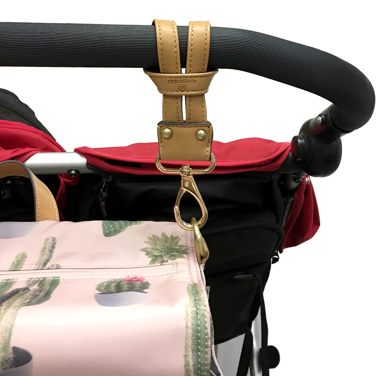 Made of vegan leather, the On-The-Go Stroller Clips can be looped through any stroller bar to attach diaper bags by the side rings with the metal dog clips. You can also easily attach shopping paper bags and grocery bags by the handles. TWELVElittle does not recommend using the stroller clips on light weight umbrella strollers since the stroller may tip over when something too heavy is hung from the clips. Underside of the vegan leather straps is lined with non-slip webbing material.