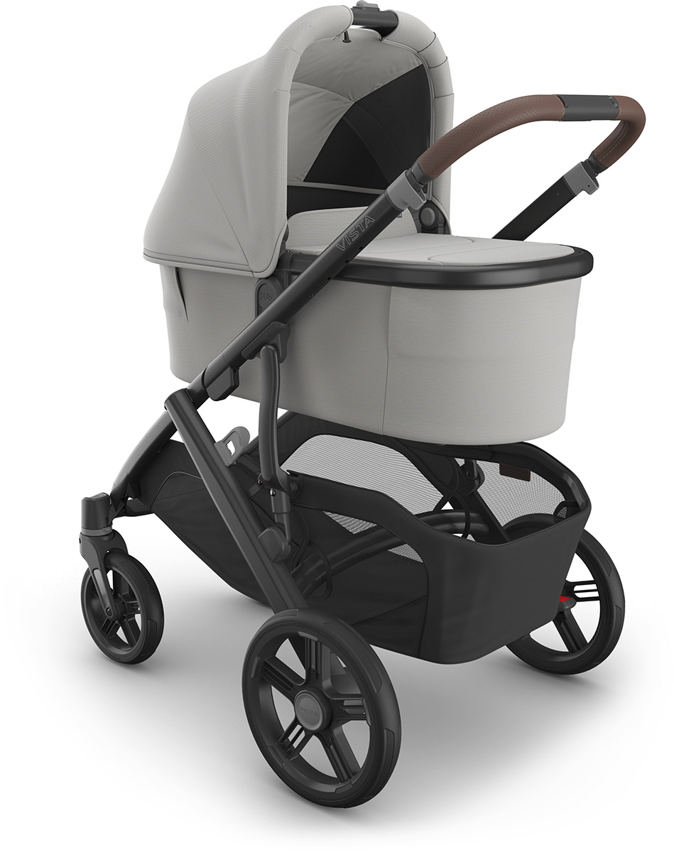 One for all. Our Vista stroller is intuitively designed to "grow" with your family! It starts as a single stroller but can easily transform to accommodate up to three children with added accessories and adapters - becoming the ultimate in portability and convenience! Features All-Weather Comfort Seat with Seasonal Seat Liner for cooler days or converts to mesh for warmer days; Enhanced FlexRide Strolling Suspension delivers a smooth ride whether strolling with 1, 2, or 3; Quick-to-secure harness system with magnetic buckle and easy-to-adjust, no-rethread harness; Parent-facing and forward-facing full size, toddler seat grows with child up to 50 lbs; Effortlessly folds in one simple step & stands when folded for compact storage; Extendable, water-repellent UPF 50+ canopy and easy-to-peek window for added air flow; Extra-large, easy-access basket with 30 lb. weight limit to easily store all your essentials while strolling; Premium fabrics and full-grain REACH certified leather details; Never flat tires for durability and smooth strolling through various terrain; Reflective trims on wheels and basket to enhance visibility while strolling; Ability to transport up to three children with RumbleSeat and PiggyBack accessories; One-handed multi-position recline for those "resting strolls"; Extendable water-repellant canopy with UPF 50+ protection, zip-out fabric, and mesh panels with covering for added protection for any weather; One-hand, adjustable handlebar to better accommodate different heights; Front wheel locks with visual indicators for parent's piece of mind; Adjustable footrest positions feet and legs comfortably as they grow; GREENGUARD Gold certified to support healthier air quality & low chemical emissions; Specifications Toddler Seat: 3 months to 50 lb; suitable from birth with Infant SnugSeat or Bassinet accessory (sold separately); Weight Frame & Seat: 27 lbs; Frame: 20 lbs; Seat: 7 lbs; Bassinet: 8.8 lbs; ; Unfolded: 36″ L x 25.7″ W x 39.5″ H; Folded with seat attached: 17.3″ L x 25.7″ W x 33.3″ H; Folded without seat attached: 13″ L x 25.7″ W x 32″ H; UPPAbaby Bassinet V3 Take your Bassinet from boulevard to bedroom by snapping it into the secure and elevated Bassinet Stand. Features Quick zip, cross ventilation panels that can be opened for greater airflow or closed for added warmth; Foam-free air mesh mattress for maximum breathability and safe overnight sleep solution; Dual zipper on bassinet boot cover easily opens and closes to tend to baby; Collapsable design for easy stow away whether traveling or limited in space; Vented window on base with covering bringing air flow from bottom to top; Extendable, UPF 50+ sunshade and mesh panels for air flow; Carry handle with an effortless one-hand stroller release for easy on-and-off attachment; Zip-out, water-repellent inner liner and boot cover are easy to remove and clean; Easy attachment options to stroller with indicators for extra security; Included Bug Shield to protect from outdoor elements; Fits directly onto Bassinet Stand Accessory; GREENGUARD Gold certified to support healthier air quality & low chemical emissions; Specifications Bassinet suitable from birth to 20 lbs or until infant can push up on hands and knees, whichever comes first; What's In The Bundle: Frame; Toddler Seat; Seasonal Seat Liner; Bumper Bar; Toddler Seat Bug Shield; Toddler Seat Rain Shield; Toddler Seat Storage Bag; 3-Year Warranty; Bassinet; Bassinet Bug Shield; Bassinet Mattress; Bassinet Mattress Cover;.