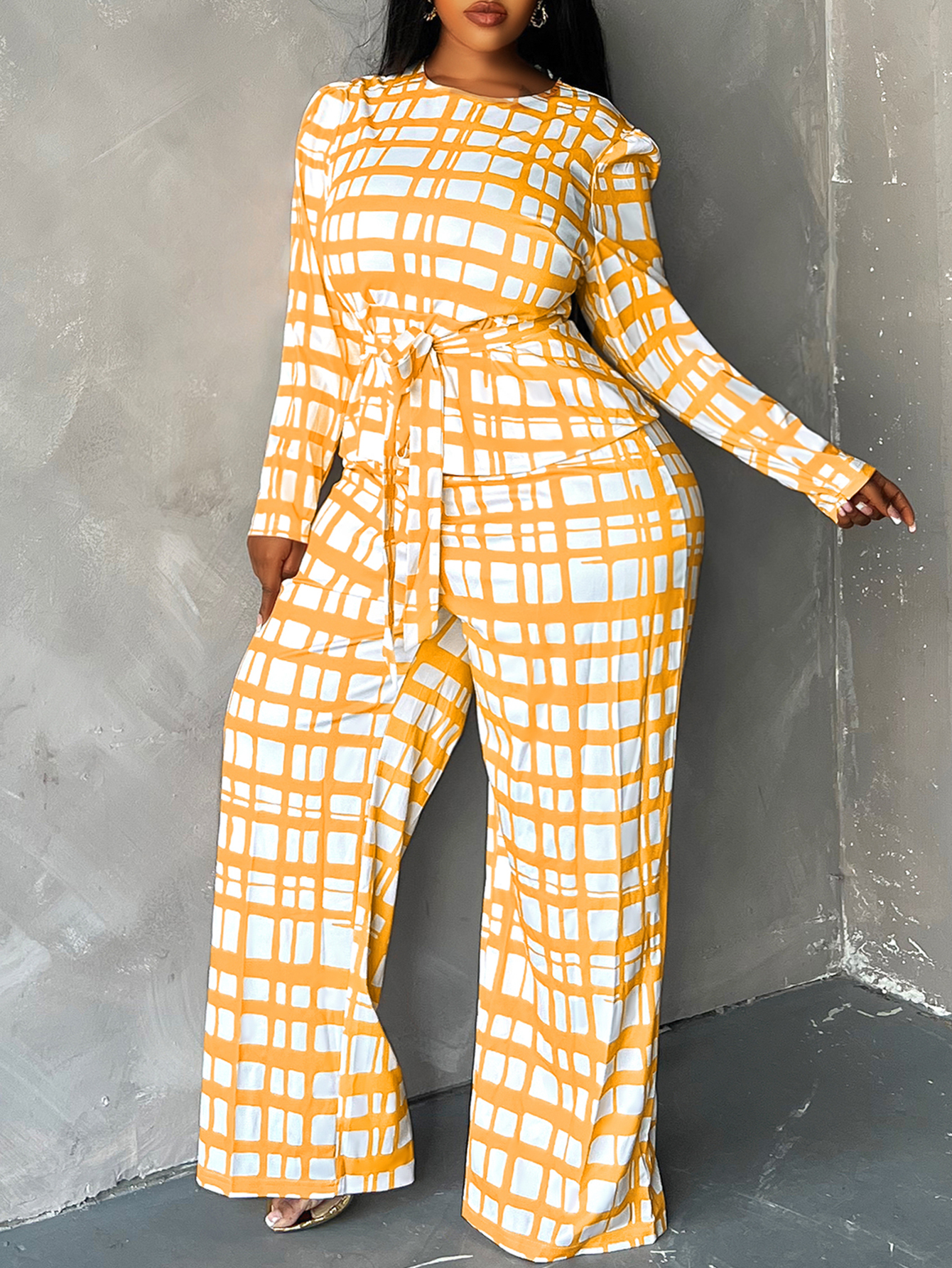 LW BASICS Plus Size Plaid Print Belt Design Pants Set.