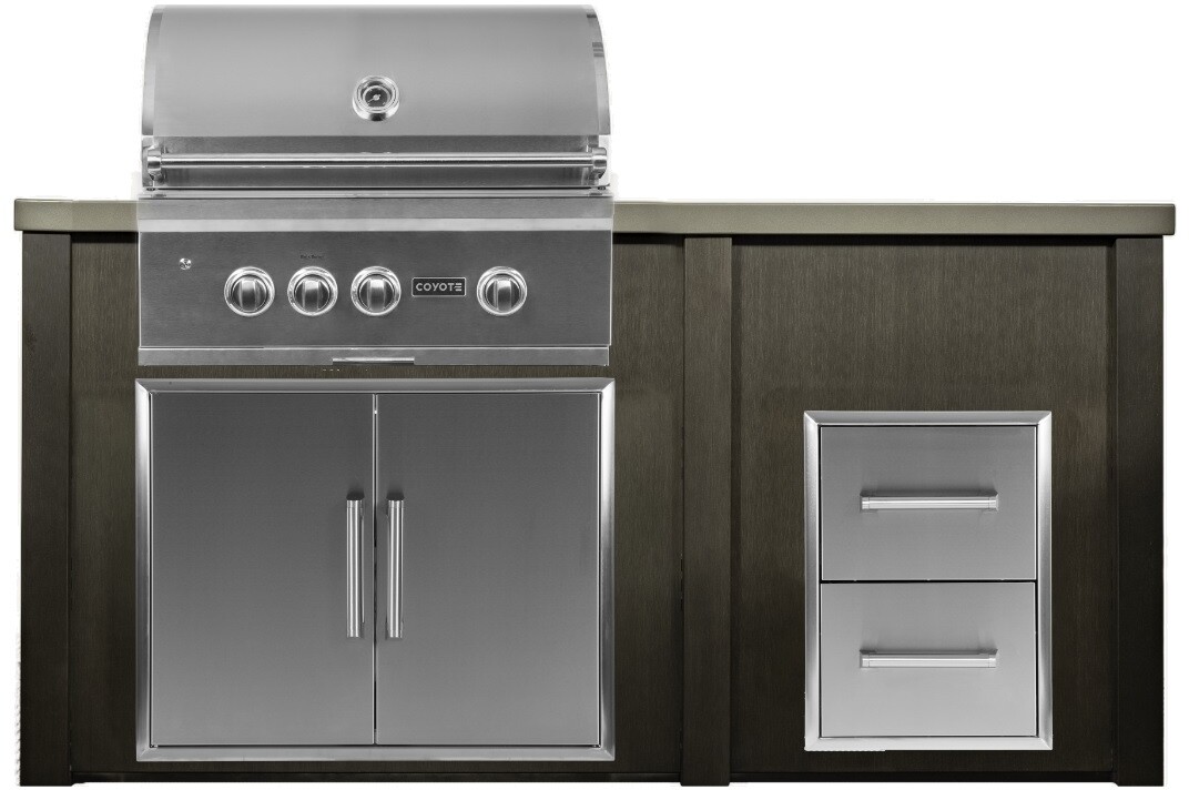 30" Liquid Propane Built-in Grill with Double Access Drawers, 2-Drawer Cabinet, and 6 ft Island in Bronze. Coyote Outdoor Appliance Package COYISLANDOP109.