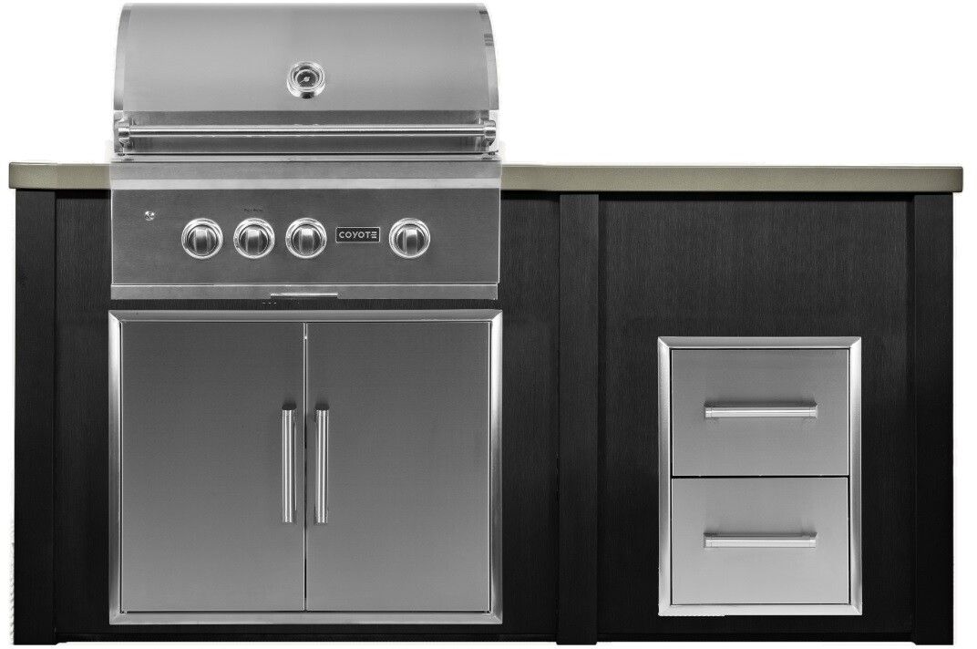 30" Liquid Propane Built-in Grill with Double Access Drawers, 2-Drawer Cabinet, and 6 ft Island in Black. Coyote Outdoor Appliance Package COYISLANDOP110.