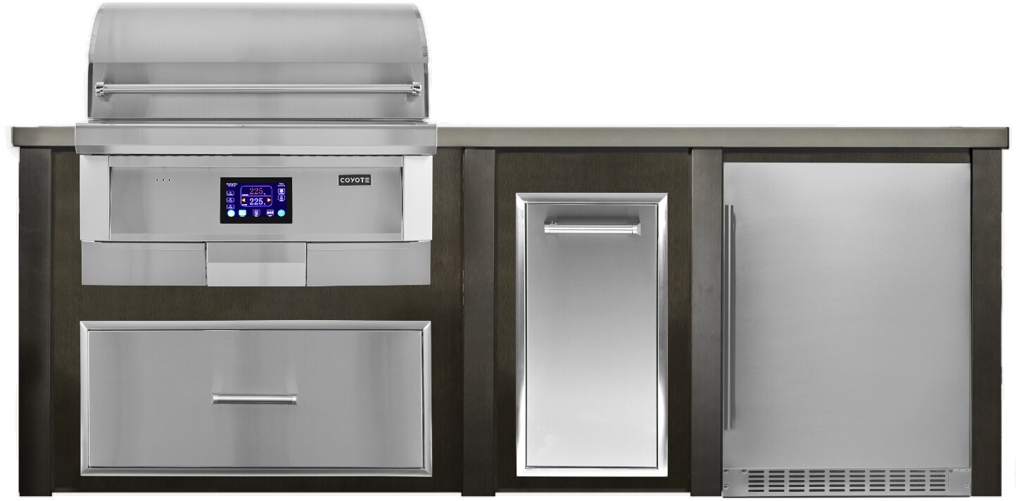 36" Built-in Pellet Grill and Smoker with 36" Sealed Drawer, Pull Out Trash, Built-in Compact Refrigerator, and 8 ft. Island in Bronze. Coyote Outdoor Appliance Package COYISLANDOP121.