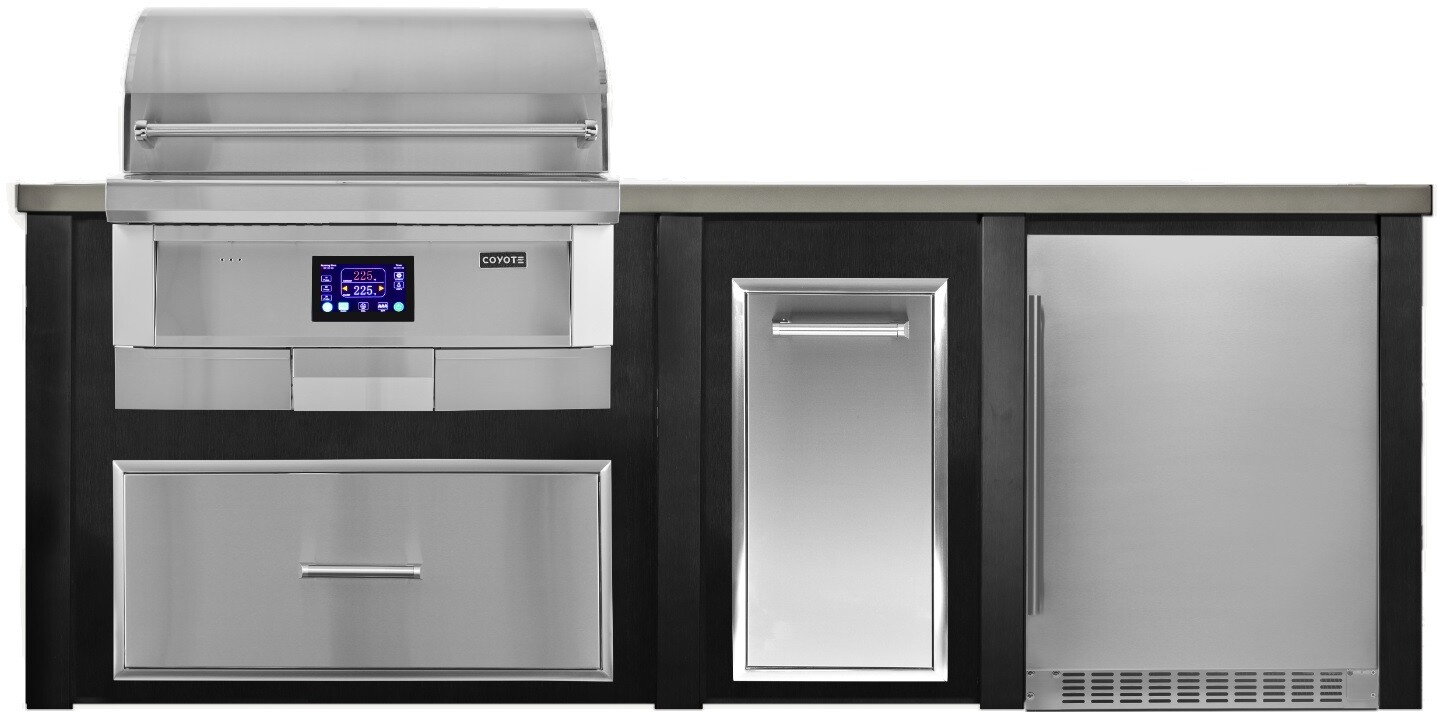 36" Built-in Pellet Grill and Smoker with 36" Sealed Drawer, Pull Out Trash, Built-in Compact Refrigerator, and 8 ft. Island in Black. Coyote Outdoor Appliance Package COYISLANDOP122.
