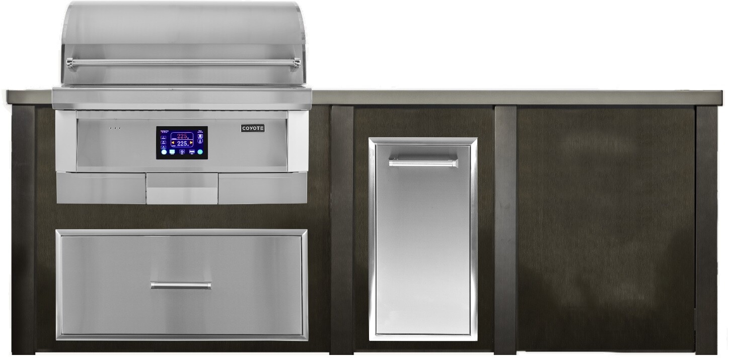 36" Built-in Pellet Grill and Smoker with 36" Sealed Drawer, Pull Out Trash, and 8 ft. Island in Bronze. Coyote Outdoor Appliance Package COYISLANDOP124.