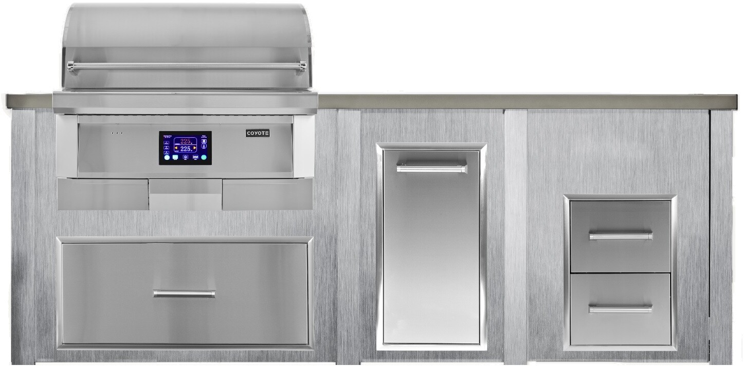 36" Built-in Pellet Grill and Smoker with 36" Sealed Drawer, Pull Out Trash, 2-Drawer Cabinet, and 8 ft. Island in Grey. Coyote Outdoor Appliance Package COYISLANDOP129.