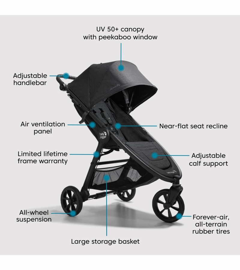 The Baby Jogger City Mini GT2 Stroller provides uncompromising agility on any terrain thanks to forever-air rubber tires that will never go flat and all-wheel suspension. It is enhanced by upgraded fabrics in rich colors that have a soft, textured feel you and baby will love. The signature one-hand compact fold, adjustable handlebar, and hand-operated parking brake provide you with the ultimate convenience, while the adjustable calf support and near-flat seat recline allow you to find the most comfortable position for your child. This item includes: Baby Jogger City Mini GT2 stroller; Infant car seat adapter; Features Baby Jogger's signature one-hand fold with auto-lock ensures easy transportation and storage; The near-flat seat recline and adjustable calf support provide maximum comfort so your child can stretch out and relax; Large storage basket holds up to 10 lb so you have everything you need within reach; Full-coverage UV 50+ canopy with a magnetic peekaboo window keeps baby shaded while allowing you to easily check in; Supports children up to 65 lb; Limited lifetime manufacturer's warranty on frame; Meets Disney size requirements; Stroller is not intended for jogging; Specifications Stroller dimensions: 41 L x 25.7 W x 42.8 H; Folded dimensions: 13 L x 25.7 W x 32.5 H; Stroller weight: 21.4 lb; Capacity: Max child weight: 65 lb; Max basket weight: 10 lb; ;.