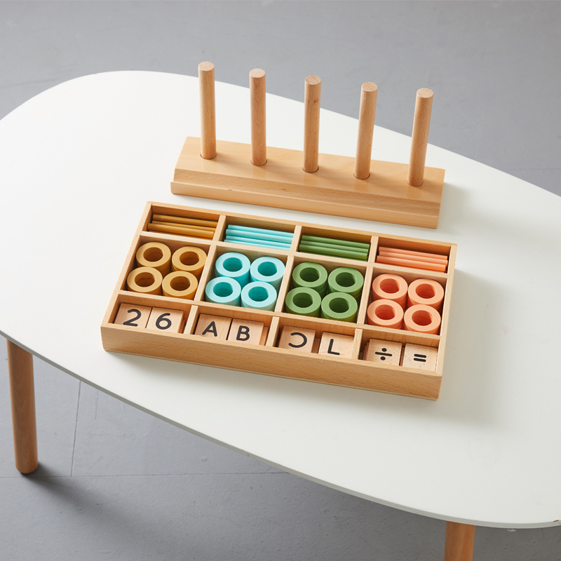The Path to Math has never been so easily paved, and is so much fun, kids won't even know they are learning! Our set comes complete with 48 color rings for stacking, 80 color coordinated sticks for counting, 24 numeric tiles with letters on the reverse side, 8 equation tiles, and a 5 ring stacker, all inside of a natural wood storage box. From the very young to school age children, Path to Math helps teach equations, counting, color matching, spelling and more. Get on the right path! Materials Wood Dimensions Storage Box 14 x 7.75 x 1.5 inchesStacker 12.5 x 6 x 3.4 Weight 5 lbs. set.