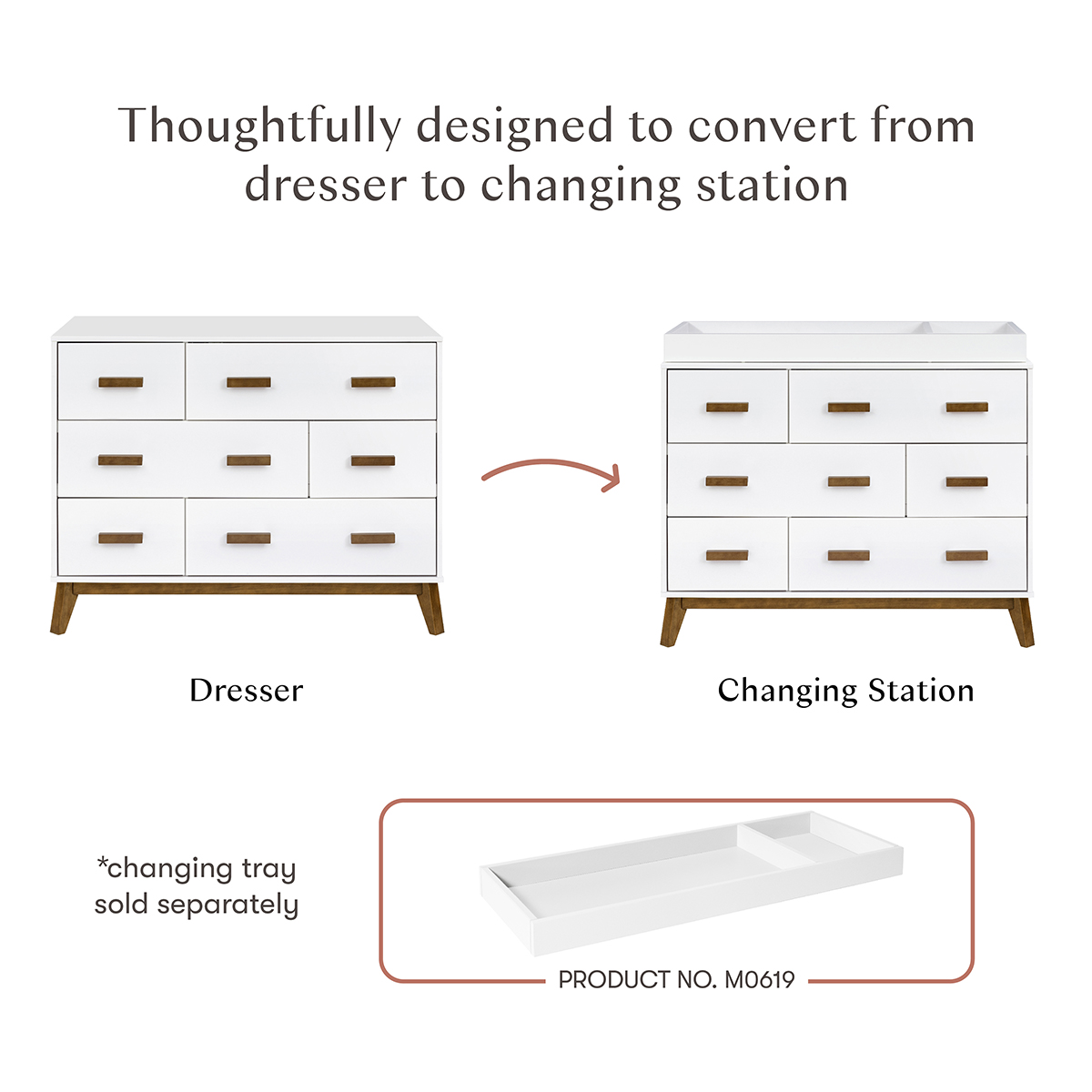 The Scoot 6-Drawer Dresser is the definition of mid-century modern style. The perfect accompaniment to your Scoot 3-in-1 Crib with matching tapered feet and two-toned or solid color detailing. With six smooth-glide drawers, this versatile unit provides a range of practical storage possibilities to suit all of your nursery needs. Features MID-CENTURY MODERN STYLE: The Scoot 6-drawer dresser brings personality and practicality together with a hint of retro styling. Pair with your Scoot 3-in-1 crib for a complete nursery look.; GREENGUARD GOLD CERTIFIED: Tested for over 10,000 chemical emissions and VOCs, undergoing rigorous scientific testing to meet some of the world's most stringent chemical emissions requirements. It contributes to cleaner indoor air, creating a healthier environment for your baby to sleep, play, and grow.; SPACIOUS & STURDY: There's a place for all of babe's outfits with three large drawers and three smaller drawers for organizing accessories with improved thick and sturdy drawer bottoms. For increased versatility and convenience, add a removable changing tray for the early years (#M0619 sold separately).; SMOOTH GLIDE DRAWERS: Pre-installed ball-bearing glides, so you can fold away clothes even during nap time. For added safety, stop mechanisms feature on the drawers to prevent them from falling out.; STURDY CONSTRUCTION & ANTI-TIP SAFE: This dresser exceeds CPSC's ASTM F2057-23 standard. The drawer extensions have been thoughtfully constructed in accordance with the regulation to reduce tip-over risk. For additional security, an anti-tip kit is also included.; SAFE FOR BABE: We go the extra step to ensure your babe's safety. Finished in a non-toxic multi-step painting and staining process that is lead and phthalate safe which exceeds ASTM International and U.S. CPSC safety standards.; SUSTAINABLE DESIGN: For sturdiness, the base is constructed with sustainably sourced New Zealand pine wood. For durability, we also use TSCA compliant engineered wood in the drawer fronts and frame.; COMPLETE YOUR NURSERY: Shop the full Scoot collection with versatile décor pieces for a stylish nursery reveal.; Specifications Made in Taiwan (R.O.C.); Assembled Dimensions: 46"L x 19"W x 35"H; Assembled Weight: 132lbs; MAXIMUM WEIGHT: 50 lbs;.