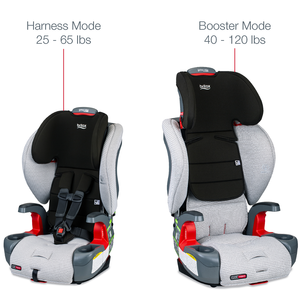 The Britax Grow With You ClickTight harness-2-booster car seat grows with your child from toddler to big kid. It's made with a 4-way stretch athleisure fabric for premium style and comfort. Install with confidence, every time. With ClickTight, you know it's right in 3 easy steps: open, buckle, close. 2 layers of side impact protection surround the head, neck & torso. Plus, SafeCell Technology in the base acts as a crumple zone to help absorb crash energy. Quickly adjust the 9-position harness & headrest using just one hand for the proper fit as your child grows. Once they're ready to use the seat belt, the 5-point harness tucks away, transitioning to a belt-positioning booster. Color-coded guides help you and your child route the seat belt through the right paths. With arm rests, cup holders and harness comfort pads, even big kids enjoy the ride. Features: Harness mode 25lbs - 65 lbs; Booster mode 40 lbs -120 lbs. ; 4-way stretch athleisure fabric combines style and function for a modern look that's easy to keep clean.; Install confidently, every time. With ClickTight, you know it's right in just 3 easy steps. Open, thread & buckle, close.; SafeCells in the car seat base create a crumple zone that absorbs crash energy to help keep it away from your child.; Industrial Strength Steel frame reinforces the seat structure to help keep it stabilized.; V-shaped tether with staged-release stitches helps slow and reduce forward movement during a crash.; Energy-absorbing chest pads reduce your child's forward movement during a collision.; 2 Layers of Side Impact Protection: Energy-absorbing shell and foam-lined headrest protect your child's head, neck, and torso.; 9-position, quick-adjust harness & headrest move together using one hand for the proper fit as your child grows.; 2-position buckle can be moved outward to accommodate your growing child.; 2 recline positions help you find the most comfortable fit for your child and the best fit for your vehicle.; 2 cup and snack holders keep drinks, snacks, and toys within reach.; Color-coded belt guides make it easy for you and your child to route the seat belt through the right paths.; Easy-to-remove cover for cleaning without uninstalling the car seat or removing the harness.; Stay-put, soft comfort pads keep your child's neck from rubbing against the harness strap.; Flip-forward buckle stays out of the way for easy boarding.; Easy-to-clean arm rests help your child ride comfortably.; Proudly designed, tested and built in the USA with US and global components for safety and quality.; Clicktight Installation: Britax's commitment to child safety inspired one of their proudest innovations to date - ClickTight Installation. They knew something had to be done about the staggering number of car seats being installed incorrectly. Despite best efforts, parents were still getting it wrong. So Britax developed a 3-step, self-tensioning system that makes it easy to achieve secure installation, every time. Specifications: Product Dimensions: 19" W x 2836" H x 21" D; Car Seat Weight: 26.5 lbs; Child Weight Capacity: Harness mode 2565 lbs; Booster mode 40120 lbs; ; Child Height Capacity: Harness mode: 34"-49"; Booster mode: 44"-63"; ;.