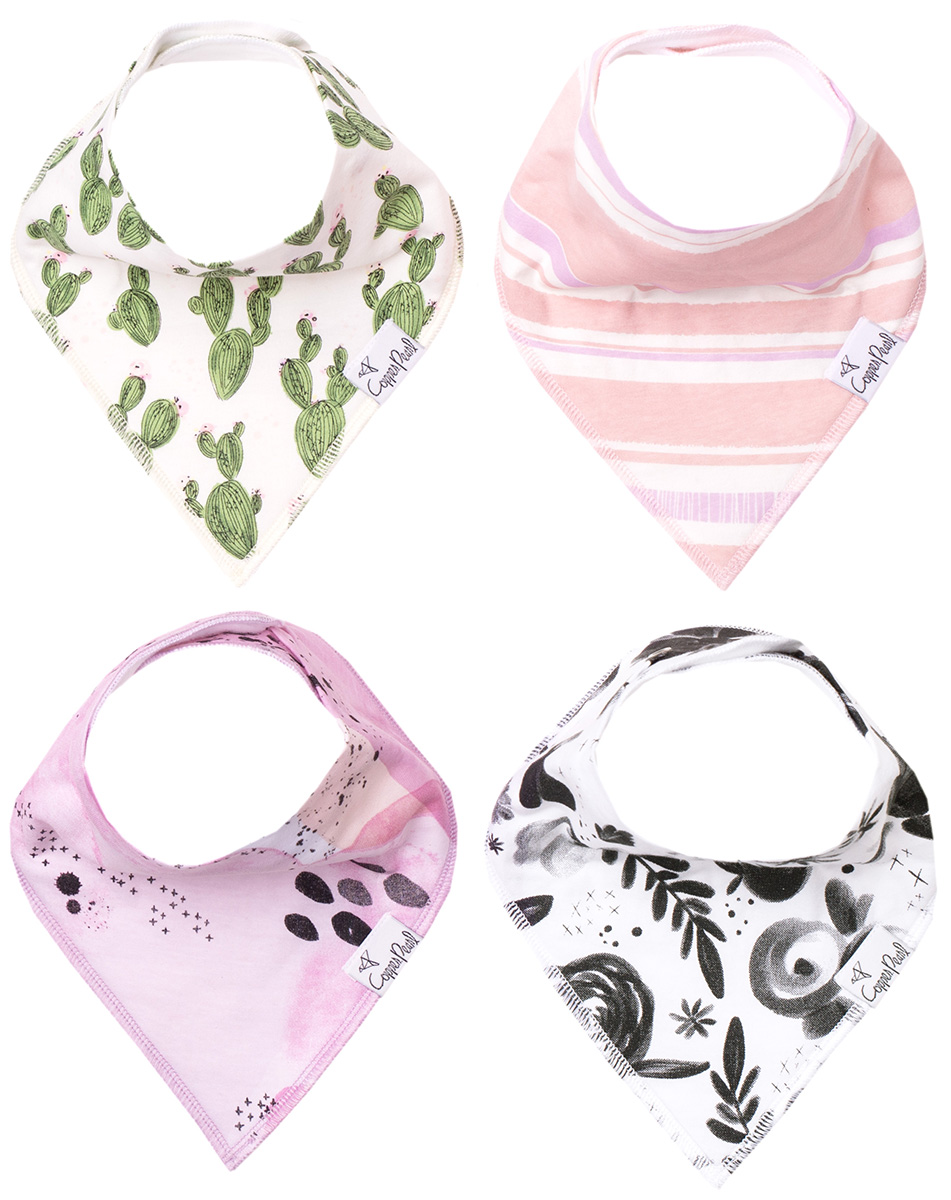 Finally, Baby bibs that are trendy, fashion forward, and functional. Your baby will have the cutest fashion accessory around, and you will keep his/her clothes clean and dry from drooling. Our bandana bibs a.k.a. bibdanas, are made of 100% cotton knit on the front and 100% soft, absorbent polyester fleece on the back. These bibs will keep your baby dry even with lots of drool and dribble. They're great for drooling and teething babies. Designs are trendy and chic so your baby's style is sure to be noticed... You'll no longer have to worry about boring and ugly bibs covering up your child's cute outfit. 2 adjustable snaps make this great for infants and toddlers (age: 3-24 months) and get rid of that annoying Velcro. Absorbent cotton drool bib These stylish drool bibs are made of 100% absorbent cotton on the front and 100% polyester fleece on the back. The front of the baby bib is a stylish knit fabric and the back is a super soft fleece that keeps your baby completely dry even with the drooliest of babies. Great for teething babies! Adjustable nickel-free snaps for ages 3-36 months Each baby bandana bib comes with 2 nickel-free snaps that allow each bib to be adjustable in size to fit newborns and toddlers, with ages ranging from 3-36 months. The snaps are secure, making it difficult for infants and toddlers to unfasten but are easy for parents to snap on and off. Trendy and stylish baby fashion accessory Our bandana bibs feature our own custom and unique designs that are trendy and fashion-forward. They're versatile and are the perfect finishing touch for any outfit. Unique baby gift set Copper Pearl's 4-pack of baby bibs makes the best gift for new parents, new grandparents, baby showers, Christmas present or for any excuse to make a baby look amazing.