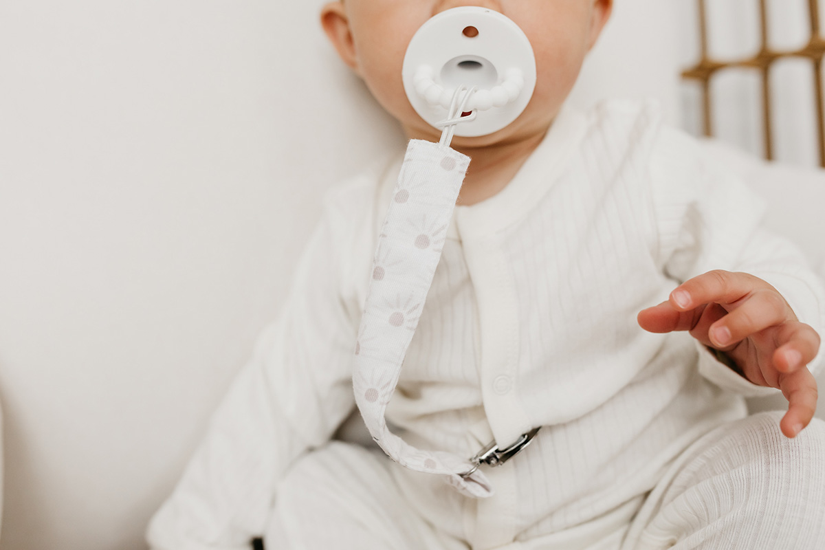 A chic way to keep baby's pacifier close at hand. Offering the ultimate blend of fashion and function, our unique Binky Clip features a premium knit strap lined with absorbent fleece to help soak up drool. Simply attach baby's pacifier or teether to one end, then fasten the clip to clothing, blankets or baby gear. Oh, and by the way our set includes three Binky Clips to keep with you wherever you go - no more floor drops or pacifier pick-ups! Premium knit fabric strap.; Stainless steel clip.; Set of 3.; Care: Machine wash cold. Tumble dry low heat.