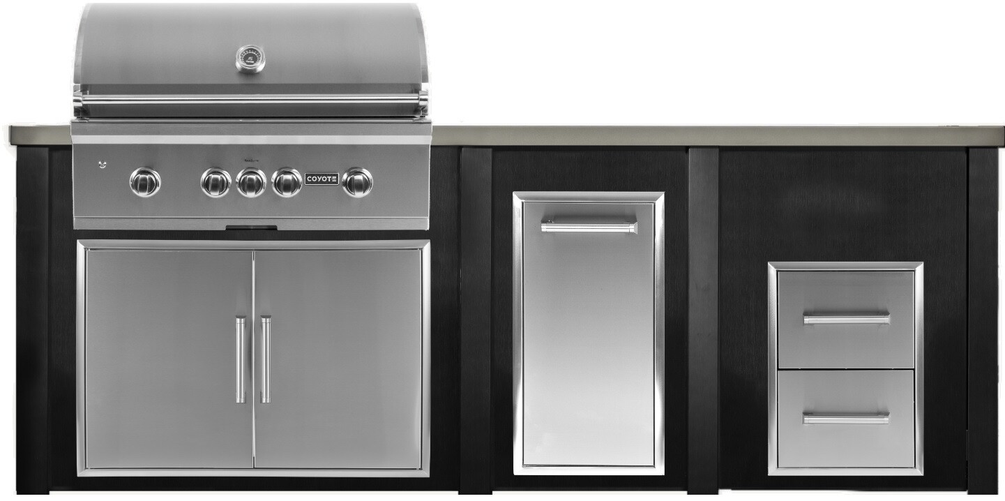 36" Natural Gas Built-in Grill with Double Access Doors, Pull Out Trash, 2-Drawer Cabinet, and 8 ft. Island in Black. Coyote Outdoor Appliance Package COYISLANDOP140.