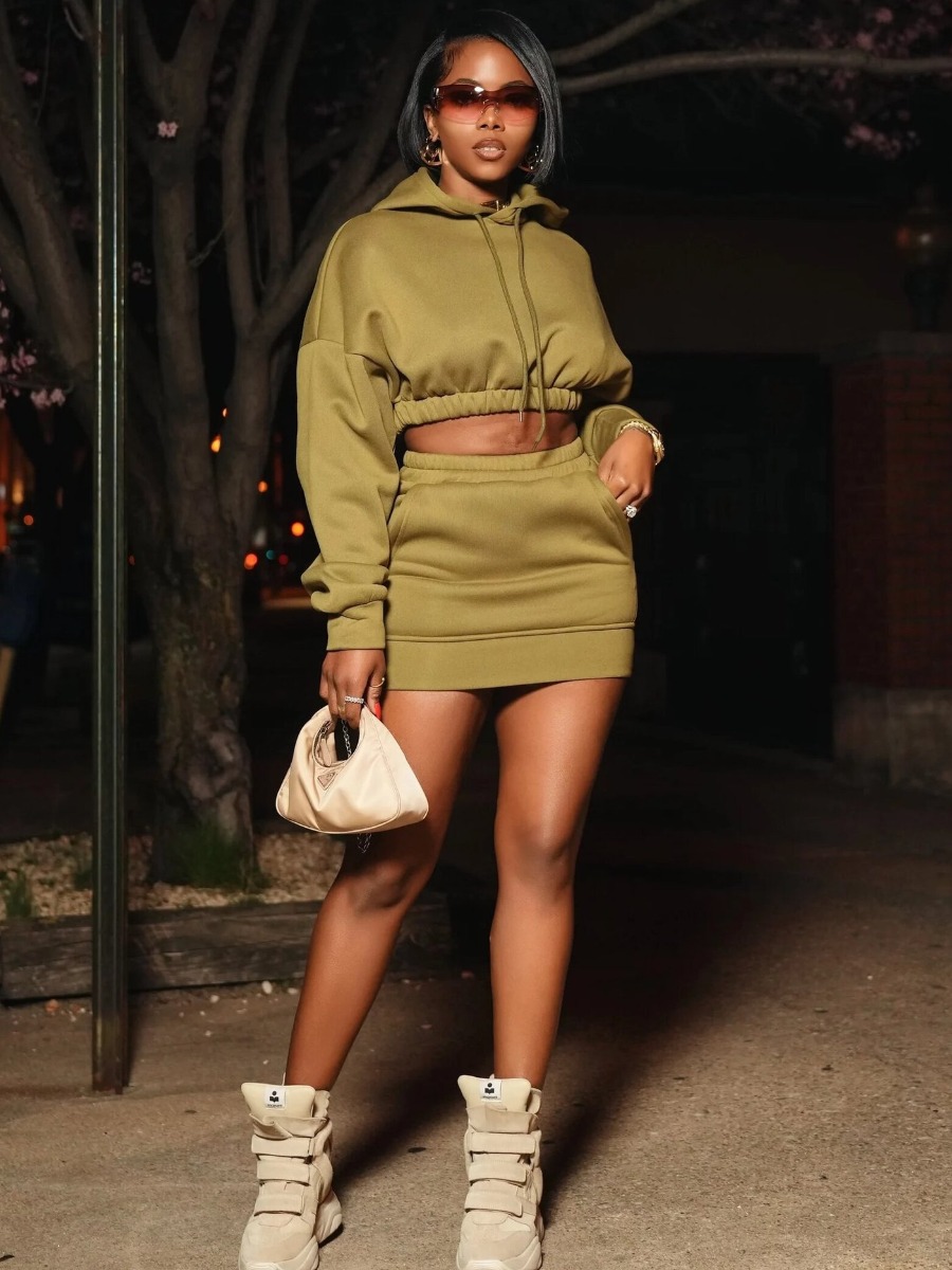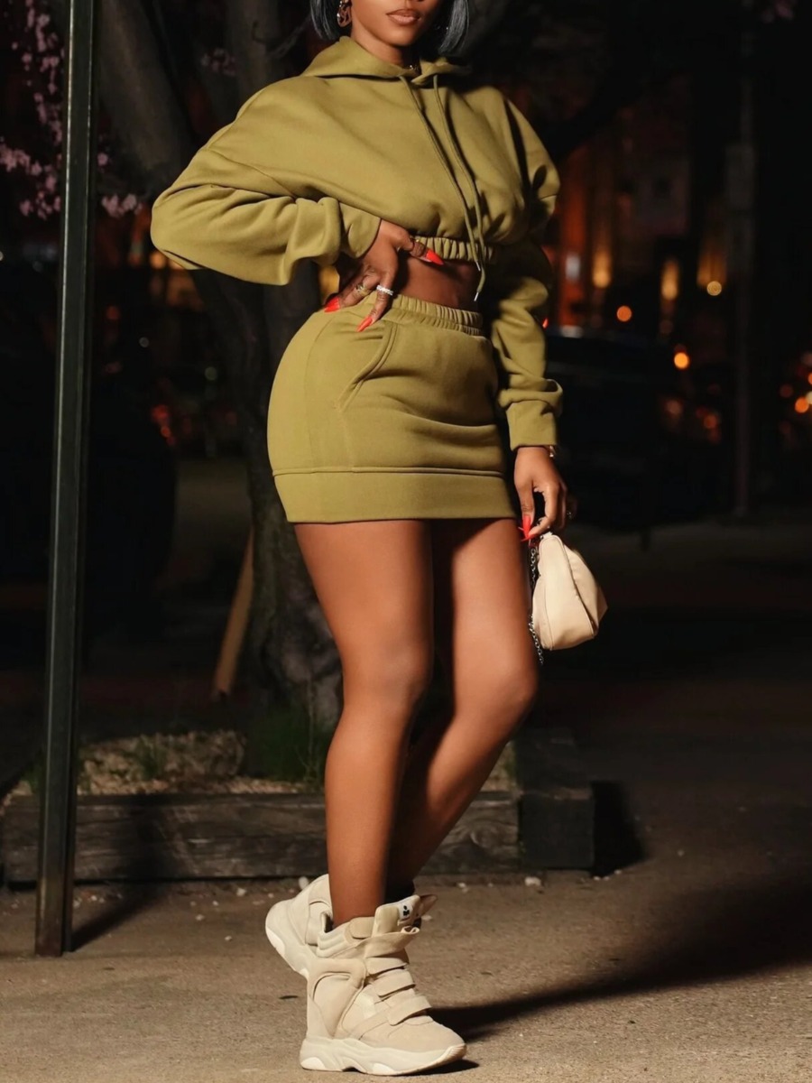 LW BASICS Casual Polyester Hooded Collar Bandage Design Solid Color Long Sleeve Two-piece Skirt Set.