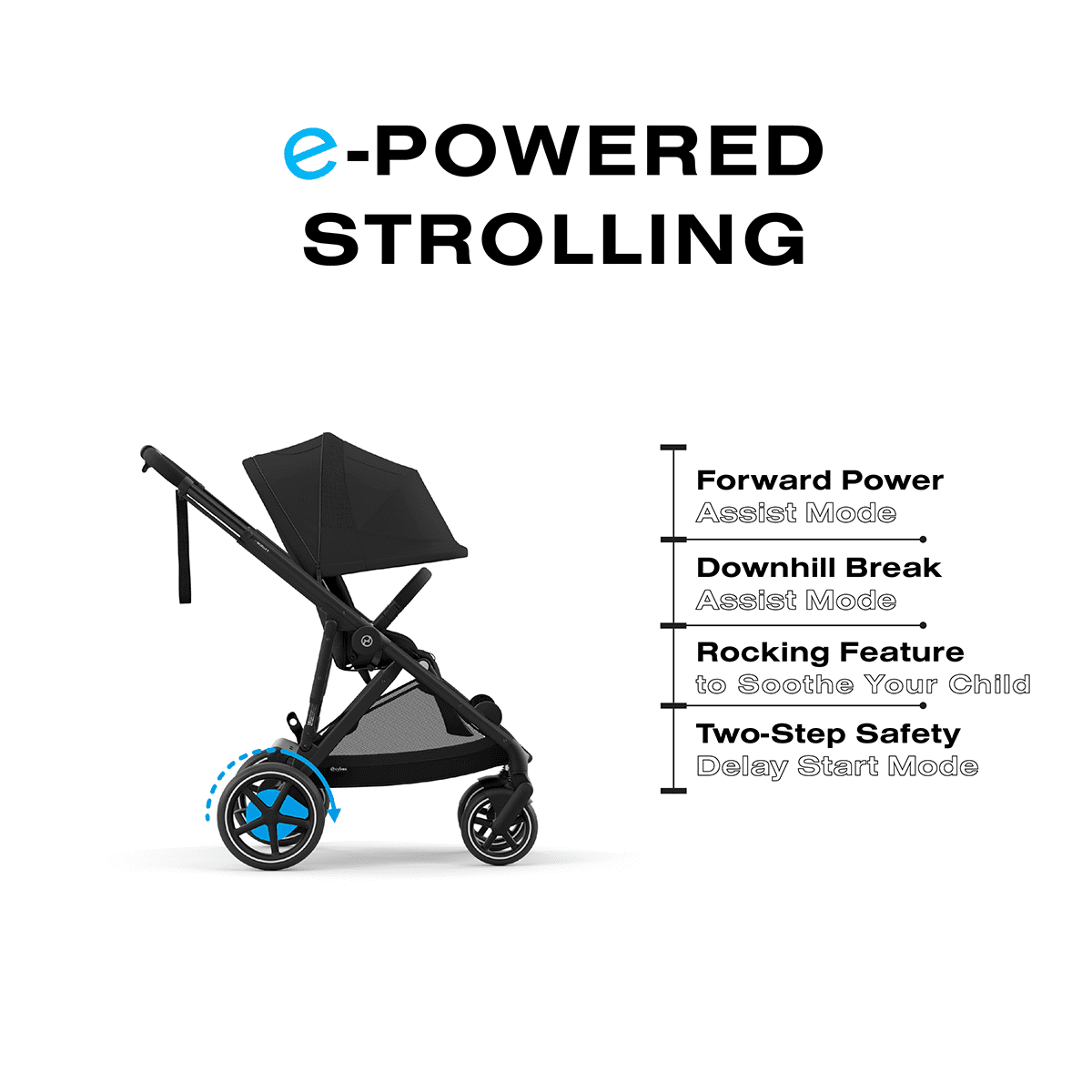 A stroller for all your adventures ahead. The CYBEX e-Gazelle stroller combines adaptability and convenience with the electric power of smart technology. Conquer any uphill climb or downhill descent and cruise through any uneven terrain effortlessly with the assistance of our electronic power on demand. Adapting to the changing needs of your family, the e-Gazelle is designed to support 20+ different configurations and easily converts from a single to double stroller. Whatever your plans are for the day, you can rely on the shopping basket and spacious lower basket for up to 55lbs. of groceries or any essentials for the journey ahead. After a long busy day, use our gentle rocking feature to help calm and soothe your child. Features: SMART ASSIST MODE: Forward power and downhill break assist mode helps control how much assistance you need with the convenient lever on the handlebar, no phone application required for use; ROCKING FEATURE: Choose between three gentle settings to soothe your child; SMART SAFETY: Includes a two-step safety delay start mode; SINGLE TO DOUBLE: Easily converts from a single to double stroller without additional adapters; 20+ CONFIGURATIONS: Add a second Gazelle Seat unit, Gazelle Cot, or any CYBEX Infant Car Seat to meet your needs. (sold separately); EASY FOLD: Folds with two seat units attached to the frame; ONE-PULL HARNESS: Our user-friendly harness system makes securing your child in the seat a breeze with one simple pull no fuss and extra handy if you're doing it twice; ONE-HAND ADJUSTABLE RECLINE: Independent reclining seat back and leg adjustments offer multiple configurations, allowing you to position your child for comfort; SHOPPING BASKET: removeable and provides extra storage up to 25 lbs.; LOWER BASKET: Extra-large, easy access lower basket for extra storage space while out on the go (30 lbs. max load); PREMIUM DESIGN: Made with a robust all-aluminum frame, leatherette handlebar and bumper bar, and high-quality fabrics; SMOOTH ALL-WHEEL SUSPENSION: All-wheel suspension with integrated frame shock absorption system provides a smooth ride over a variety of surfaces; XXL SUN CANOPY: Extendable XXL sun canopy with mesh window and a UPF 50+ rating; REVERSIBLE SEAT UNIT: Large, reversible seat unit reclines to a near-flat position; WEIGHT CAPACITY: 50 lbs. weight capacity for each seat unit (second seat unit sold separately); HEIGHT-ADJUSTABLE HANDLEBAR: One-hand, height-adjustable handlebar offers comfortable steering for all users; TRAVEL SYSTEM READY: Versatile 3-in-1 Travel System with the seat unit, Gazelle Cot (sold separately), and any CYBEX Infant Car Seat (sold separately); Specifications Stroller Brakes: Foot pedal parking brake; Lock/Swivel Wheel: Lockable front swivel wheels, lockable rear wheels; Stroller Wheel Type: Foam Filled Tires; Front Wheel Diameter: 7.9; Rear Wheel Diameter: 11; Stroller Measurements Assembled: 42.3"L X 26"W X 43.3"H; Stroller Measurements Folded: 32.3"L X 26"W X 15.3"H; Stroller Weight: 32.4; Suitable from 3 mos to 50 lbs; What's In The Box eGazelle Stroller Frame; 1 Seat Unit, Bumper Bar; Shopping Basket; Battery Pack; Charger; Rain Cover; Car Seat Adapters; Cup Holder;.