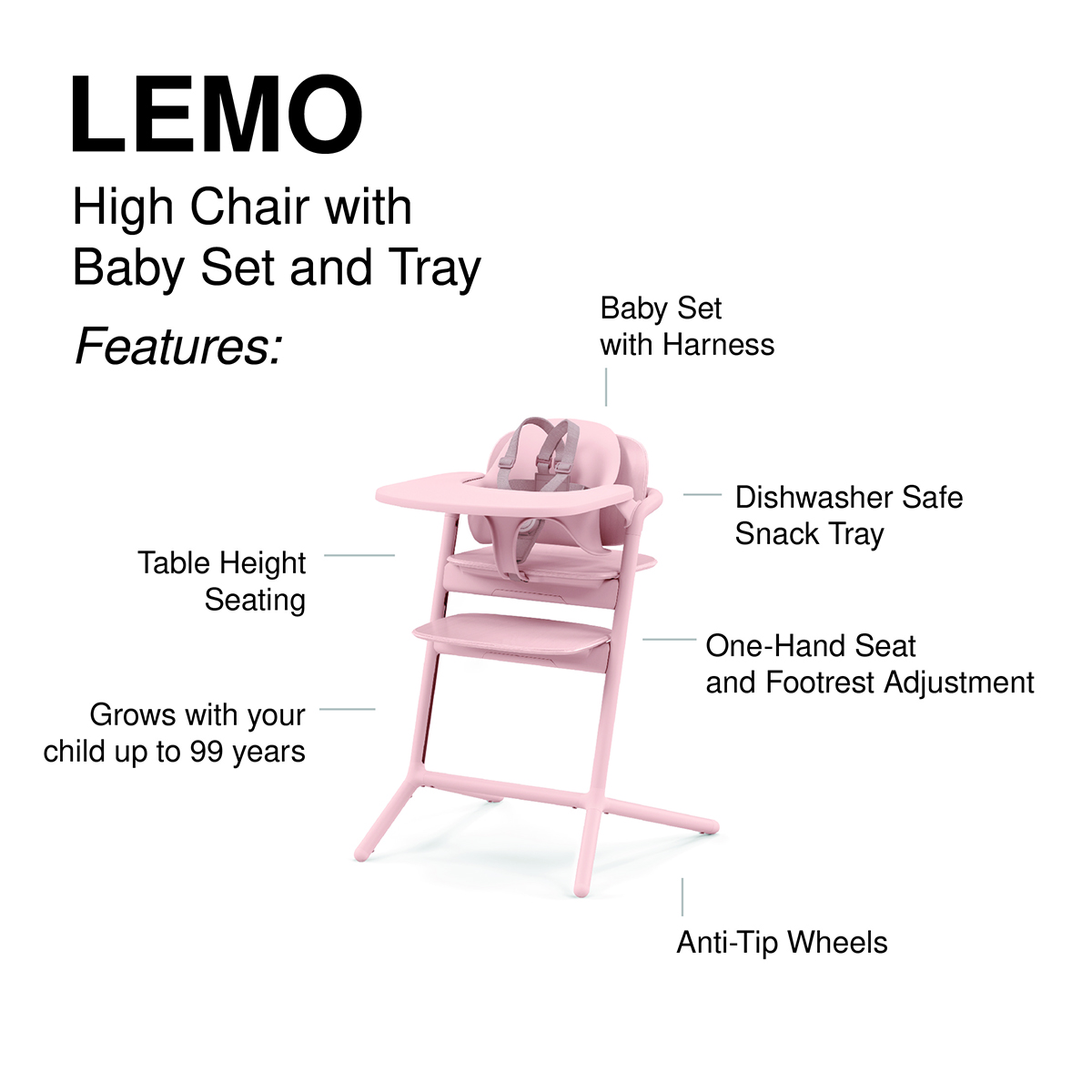 The CYBEX LEMO 3-in-1 High Chair offers a versatile choice that grows with your baby and fits seamlessly into your lifestyle. At 6 months, use the Baby Set and Snack Tray to make mealtime a breeze. As your child grows, remove the accessories to transform the LEMO into an everyday chair that can be used for many years to come. No tools are required and only one hand is needed to make to adjust the chair's height and depth; The Lemo is a timeless furniture piece for ages up to 99 years, with the Bouncer Nest (sold separately) and Baby Set (included) providing support when needed; Featuring an intuitive design with clean and minimalist lines, the Lemo is a long-lasting furniture concept meeting all your child's needs; Numerous depth positions ensure comfortable seating as your child grows; Always the perfect fit: Individual height adjustment allows optimized, ergonomic seating for all ages; Wheels on the rear legs reduce tipping risk and make it easy to move the chair around your home; The Cybex Lemo 2 3-in-1 High Chair includes: Lemo Chair; Lemo Baby Set; Lemo Tray; User Guide; Specifications: Dimensions: 22" L x 21.5" W x 32.1" H; Weight: 16.9 lbs; Suitability: Baby Set: from 6 mos to 3 years; max 33 lbs. Stand-alone chair: from 3 up to 99 years; Seat Height: 1522.5";.
