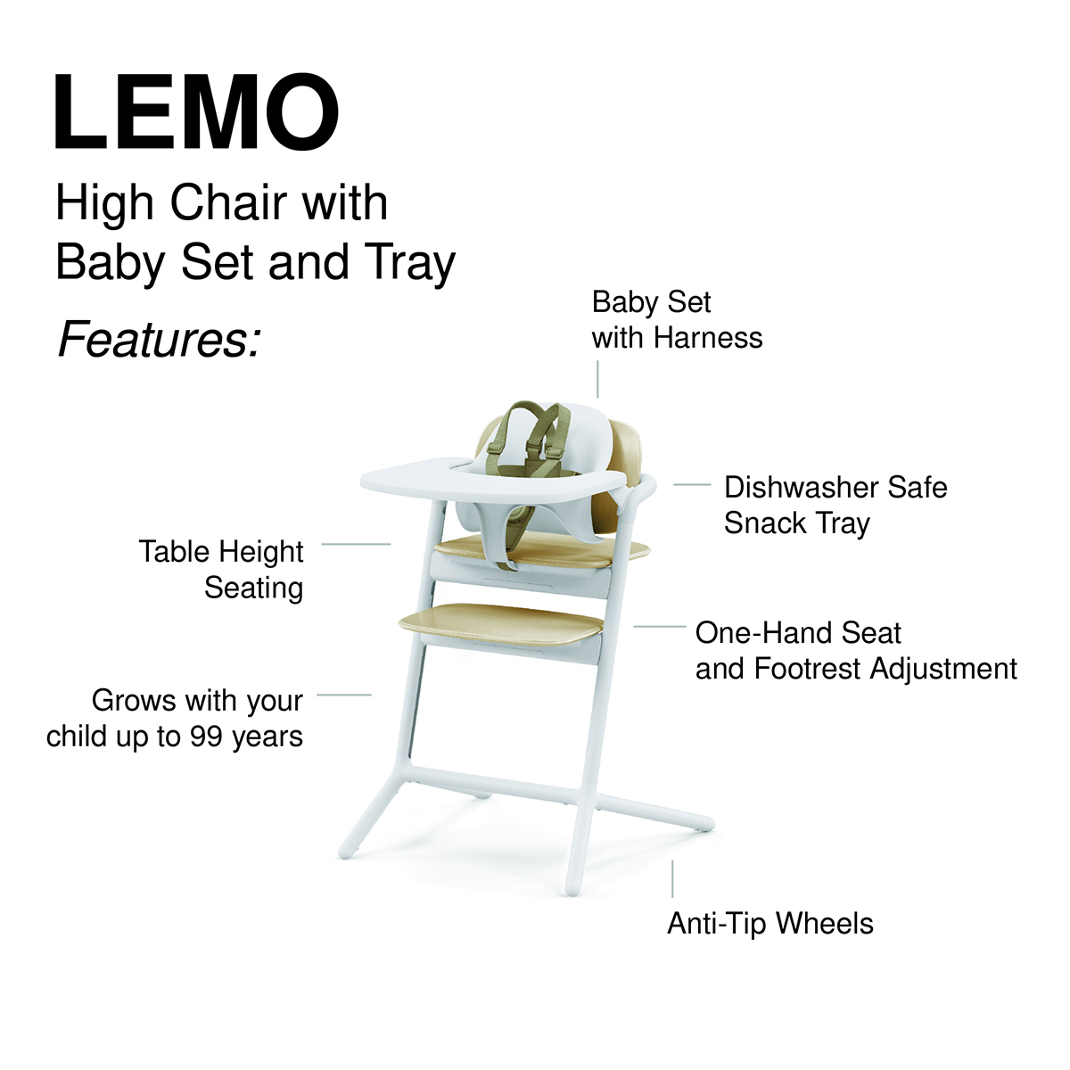 The CYBEX LEMO 3-in-1 High Chair offers a versatile choice that grows with your baby and fits seamlessly into your lifestyle. At 6 months, use the Baby Set and Snack Tray to make mealtime a breeze. As your child grows, remove the accessories to transform the LEMO into an everyday chair that can be used for many years to come. No tools are required and only one hand is needed to make to adjust the chair's height and depth; The Lemo is a timeless furniture piece for ages up to 99 years, with the Bouncer Nest (sold separately) and Baby Set (included) providing support when needed; Featuring an intuitive design with clean and minimalist lines, the Lemo is a long-lasting furniture concept meeting all your child's needs; Numerous depth positions ensure comfortable seating as your child grows; Always the perfect fit: Individual height adjustment allows optimized, ergonomic seating for all ages; Wheels on the rear legs reduce tipping risk and make it easy to move the chair around your home; The Cybex Lemo 2 3-in-1 High Chair includes: Lemo Chair; Lemo Baby Set; Lemo Tray; User Guide; Specifications: Dimensions: 22" L x 21.5" W x 32.1" H; Weight: 16.9 lbs; Suitability: Baby Set: from 6 mos to 3 years; max 33 lbs. Stand-alone chair: from 3 up to 99 years; Seat Height: 1522.5";.