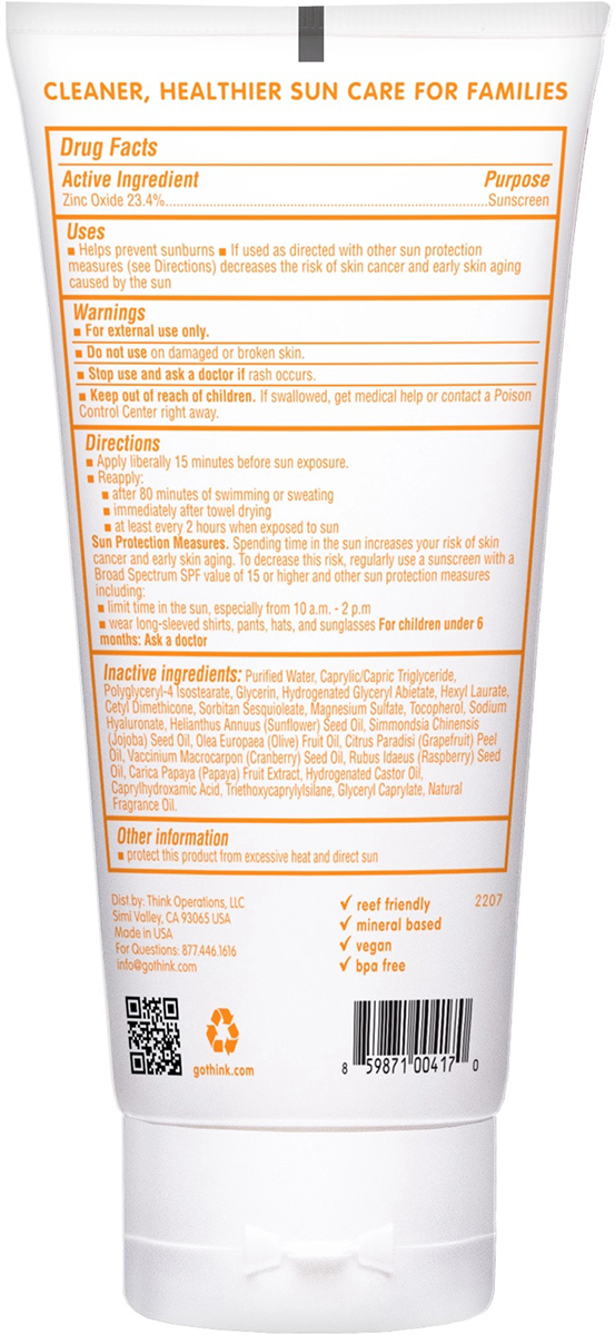 Safe and gentle on baby's delicate skin, this reef-safe sunscreen is made with all-mineral, non-nano Zinc Oxide to protect your little one from harmful UVA/UVB radiation. Now in a bigger tube so that you and your entire family can enjoy some protected fun in the sun! What Makes Think Baby Sunscreen a safer alternative? BPA Free; Mineral based; Biodegradable; Reef Safe; Water Resistant up to 80 minutes; Paraben free; Pediatrician-dermatologist tested; Free of biologically harmful chemicals. No PABA, parabens, phthalates, BPA, oxybenzone, avobenzone, petroleum, gluten, dairy, or toxic chemicals. No animal by-products or testing; Enjoy the sun with your baby year-round with highly efficacious, gentle ingredients. ThinkBaby Sunscreen has got you (and your baby) covered (literally __)! SPF 50 broad-spectrum UVA and UVB protection; Applies and absorbs easily; Non-oily feel; Made and manufactured in the USA; Use & Care How do I apply Thinkbaby and Thinksport Sunscreen? Thinkbaby and Thinksport sunscreens are perfect for daily use and for anyone spending time in the sun, including pregnant women, children over 6 months, and for anyone with sensitive skin. Please note that use of sunscreen on children younger than 6 months of age requires a doctor's prescription. This is true for ALL brands. It will maintain its SPF after 80 minutes of water immersion. The Environmental Working Group and the FDA recommend reapplying sunscreen every two hours.Thinkbaby and Thinksport sunscreens are perfect for sensitive skin. We recommend testing on a small area of the body to ensure that you don't have any sensitivities. Tips for ApplicationThinkbaby and Thinksport formula applies easily and absorbs quickly. Be sure to apply all areas that will be exposed to sunlight, including behind the ears, neck, hands, feet, and scalp. Reapply every two hours or more as needed. Ingredients Active Ingredient: Zinc Oxide 23.4% (Non-nano) INACTIVE INGREDIENTS: PURIFIED WATER, CAPRYLIC/CAPRIC TRIGLYCERIDE, POLYGLYCERYL-4 ISOSTEARATE, GLYCERIN, HYDROGENATED GLYCERYL ABIETATE, HEXYL LAURATE, CETYL DIMETHICONE, SORBITAN SESQUIOLEATE, MAGNESIUM SULFATE, TOCOPHEROL, SODIUM HYALURONATE, HELIANTHUS ANNUUS (SUNFLOWER) SEED OIL, SIMMONDSIA CHINENSIS (JOJOBA) SEED OIL, OLEA EUROPAEA (OLIVE) FRUIT OIL, CITRUS PARADISI (GRAPEFRUIT) PEEL OIL, VACCINIUM MACROCARPON (CRANBERRY) SEED OIL, RUBUS IDAEUS (RASPBERRY) SEED OIL, CARICA PAPAYA (PAPAYA) FRUIT EXTRACT, HYDROGENATED CASTOR OIL, CAPRYLHYDROXAMIC ACID, TRIETHOXYCAPRYLYLSILANE, GLYCERYL CAPRYLATE, NATURAL FRAGRANCE OIL.