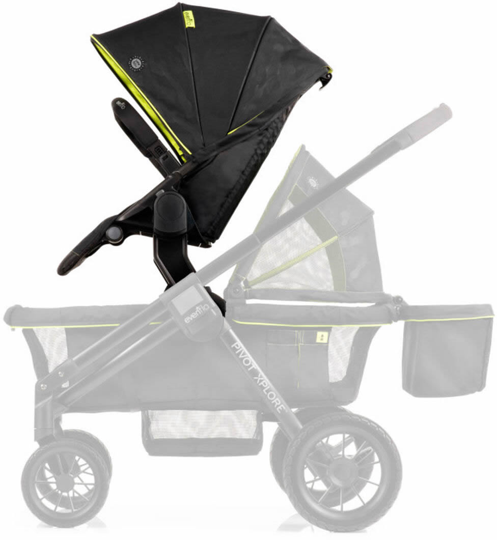 For those looking for a secure second seat to add to their Evenflo Pivot Xplore All- Terrain Stroller Wagon, this additional seat is the perfect solution that keeps your little one closer to you at an elevated level while still leaving plenty of room for a second rider below. For a child up to 55 lb, this second seat provides more flexibility to your existing Pivot Xplore by offering a modular design that can be parent-facing or forward-facing and allows your baby to recline. Whether you want to push or pull the Pivot Xplore, just flip the handle without even removing the second seat. Built for convenience, comfort and safety, the second seat includes the necessary adapters, as well as a back-rider child tray with cup holder for an on-the-go snack station within reach. The two-position recline and adjustable footrest combined with an easy access in-seat child pocket means your child will be set for the ride ahead. Five-point harness with comfort covers, and a removable bumper bar because safety is a priority. And, the large canopy with UPF 50+ sun protection includes a mesh peek-a-boo panel for ventilation and quick checks. The Pivot Xplore Stroller Wagon Second Seat is safe, durable and rigorously tested to hold up against frequent use. VERSATILE MODULAR SEAT: With two kids in tow, the versatile second seat fits perfectly on the Evenflo Pivot Xplore All-Terrain Stroller Wagon. It accommodates a child up to 55 lb at a secure, elevated level closer to you while still leaving plenty of room for a second rider below. Push or pull the Pivot Xplore with a flip of the handle without removing the second seat.; PROTECTION WHEN YOU NEED IT: Large canopy with UPF 50+ sun protection, and a mesh peek-a-boo panel for ventilation and quick checks; MULTI-POSITION RECLINE: The two-position recline and adjustable footrest is comfortable for babies; SNACK & GO: The included back-rider child tray with cup holder provides a snack station for the rider below while the second seat is in place; STORAGE: An easy access in-seat child pocket means your child will be set for the ride ahead; SAFETY IS A PRIORITY: Five-position harness with comfort covers, and a removable bumper bar. It's a safe, durable, and rigorously tested seat that will hold up against frequent use; Specifications: Weight Capacity: Up to 55 lbs.; Product Weight: 34.7;.