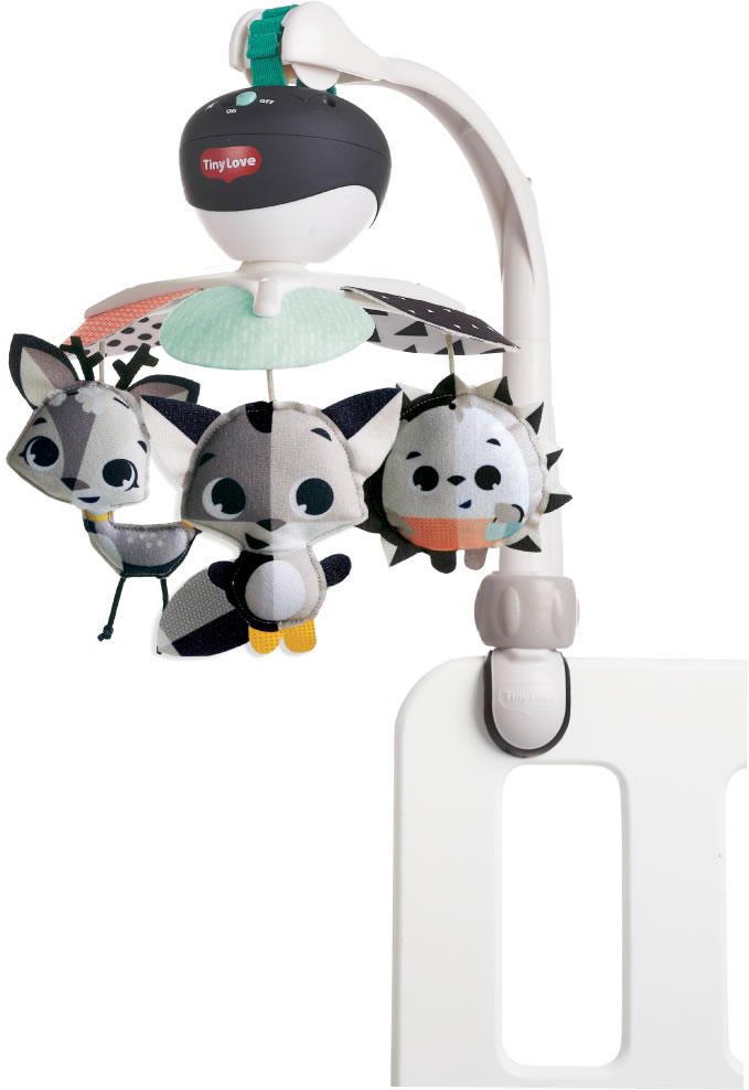 Uniquely designed developmental black & white Take-Along Mobile for on the go fun. Let's develop in style! THE PERFECT VISUAL STIMULATION. The 3-in-1 development mobile's design uses contrasting black & white colors to encourage baby's sight from day one.; CALMING AUDITORY STIMULATION: 30 mins of continuous music featuring 5 different tunes. Fun music at home and on the go.; 3-IN-1 ON THE GO TOY - Designated connector allows you to attach the mobile to most play yards, travel cots, strollers and bassinets.; ENGAGING DESIGN. Adorable Magical Tales dolls engage baby with their clearly defined design and smiling faces.; Features: Large stroller clip; Universal attachment fits most play yards, travel cots, strollers and bassinets; Hook-and-loop fastener; Up to 30 minutes of music and 5 different melodies; Age Tips: 0-3+ months: EQ From a very young age, babies will appreciate the sense of security and continuity invoked by taking this mobile along everywhere they go. 0-3+ months: SENSES The mobile's contrasting black & white design offers the ideal visual stimulation for younger babies whose sight is still undeveloped and blurred. The clear design and smiling faces will stimulate baby's sense of sight and encourage its development. 3-6+ months: LANGUAGE & COMMUNICATION Point out to the smiling characters hanging on the mobile to start building baby?s vocabulary: ?Where is the Christopher the Fox? Here he is! Where is Marie the Hedgehog? There she is!? Developmental Wonders Senses: The unique black & white design, the smiling characters? large eyes and the mobile?s slow motion along with the soft music offer important auditory and visual stimulation, encouraging the development of baby's senses. EQ: Feeling secure is a crucial element in baby's proper development. Having soothing , familiar music available in unfamiliar, new places reassures baby and supports emotional development. Language & Communication: While babies lie in their crib or sit in their stroller, cooing at the friendly mobile characters, smiling and practicing some baby talk, they practice their communication and language skills.