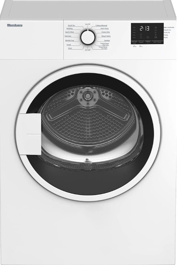 24" Compact Electric Dryer with 3.7 cu ft Capacity, OptiSense, Anti-Creasing Option, End of Cycle Buzzer, Child Lock, Clean Filter Indicator, Bi-Directional Drum Action and Stack Kit Included. With its 24-inch width, the dryer is ideal for apartments, small homes, or other areas where space is limited. It fits seamlessly into compact laundry rooms, closets, or even stacked with a compatible washer. Despite its compact size, the dryer offers a sizable drum capacity, capable of handling moderate-sized loads, making it suitable for small households or apartments. Blomberg electric dryers are designed with energy-saving features, often boasting Energy Star ratings. The heat pump technology, combined with precision sensors, ensures minimal energy usage while achieving effective drying. Equipped with a variety of drying programs for different fabric types and load sizes, such as cotton, delicates, wool, and mixed loads. These programs allow for customized care depending on the laundry needs. Includes sensor drying technology, which automatically detects the moisture level in the clothes and adjusts the drying time accordingly. This prevents over-drying and protects fabrics, while also saving energy. Features a reversible door for flexible installation, allowing users to customize the door swing direction based on the layout of their space. Designed for quiet operation, this dryer operates at low noise levels, making it a good choice for apartments or homes where minimizing noise is important. The dryer includes intuitive digital controls with a clear display, offering easy navigation through the various drying options and settings. Anti-Wrinkle Function: Comes with an anti-wrinkle function that tumbles clothes intermittently at the end of the cycle, reducing wrinkles and making clothes easier to iron or wear immediately. Stackable Design: The compact dryer is stackable with a matching compact washer (sold separately), providing a space-efficient laundry setup, perfect for tight spaces. Gentle Drying: Blomberg dryers often feature gentle heat settings for delicate fabrics, ensuring that clothes are dried at lower temperatures to protect more fragile materials. Interior Drum Light: Some models come with an interior drum light, which helps users easily load and unload the dryer, ensuring no clothing items are left behind. Dryer Type: Electric Air-vented. Capacity cu. ft.: 3.7. Dryer load capacity kg: 7. Dryer load capacity lbs.: 15.4. Drum material: Galvanized steel. Control: Digital display. Delay Time: 0-24 hours. Number of Cycles: 15. Normal / Regular cotton: Yes. Permanent press: Yes. Heavy Duty: Yes. Mixed fabric: Yes. Delicates: Yes. Air Fluff / no heat: Yes. Woolens: Yes. Towel: Yes. Wrinkle Free: Yes. Baby sanitize: Yes. Jogging Wear: Yes. Bedding: Yes. Quick Dry 30 min: Yes. Timed Dry: High Temperature Low Temperature. End of cycle buzzer: Yes. Child lock: Yes. Clean filter indicator: Yes. Bi-directional drum action: Yes. Product Dimensions (HxWxD) in: 33 1/4 x 23 7/16 x 22 15/16. Product Weight lbs.: 73.4. Product Weight kg: 33.3. Rated Current Amps: 9.1-10.5. Voltage/ Frequency: 208240 V / 60 Hz.