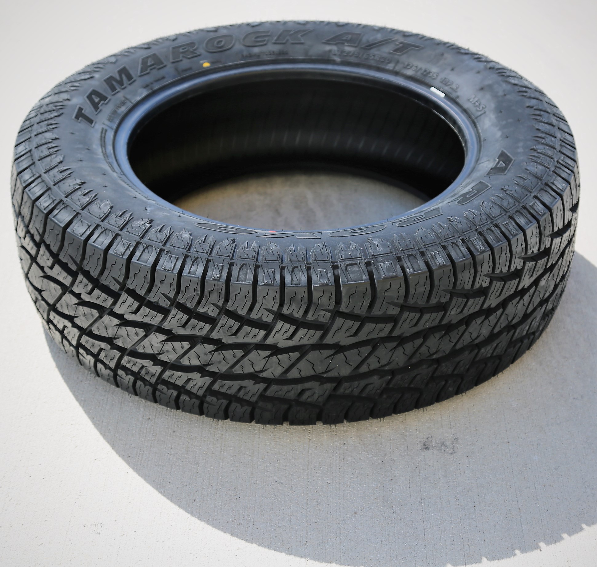 Arroyo Tamarock A/T. FEATURES AND BENEFITS: All terrain traction; Enhanced controllability; All season traction; Longer lasting tread life; . OVERVIEW: The Arroyo Tamarock A/T is an all terrain, all season tire manufactured for SUVs and light trucks. Arroyo offers a 50,000 mile treadwear warranty with this model.The optimal tread design enhances the all terrain traction. The staggered tread blocks and wide grooves increase the model's off-road performing ability. These elements boost the dry, wet and winter weather grip on the road surface. In this manner, the tire can easily conquer all terrain surface conditions by maintaining the traction, including when performing in deep mud and on loose dirt. The tread's staggered elements and high void ratio keep the footprint clean. They eliminate mud and snow and eject rocks stuck between the tread elements. This prevents mud and snow from blocking the tire's surface contact, while it actively resists stone retention from harming the casing, guaranteeing a safer off-road performance.The tread's constant surface contact upgrades the controllability. The flat footprint maintains the tire's surface contact throughout the drive, boosting the steering responsiveness and the driving stability. The steering becomes faster and more precise in its response to the driver's commands, while the structural stability is secured against the driving pressure affecting the model. The stronger construction enhances the load durability. It strengthens the construction against the heavy load and driving pressure affecting the model, which boosts the load carrying and withstanding capability significantly.The tire's durable compound and optimal tread pattern work together to increase its usability. The stronger wear-resistant compound enhances the tread life by decreasing the tread wear rate during the tire's lifetime. The stabilized tread elements prevent tread flexing and ensure even pressure distribution along the tread area as there is no unnecessary friction generated between the tire and the road surface. This combination greatly extends the model's service and tread life.The Tamarock A/T promotes great all weather traction. The staggered tread blocks and the optimal tread design enhance the dry, wet and winter weather road gripping ability. The compound keeps the rubber flexibility in various temperatures, while the tread upgrades the grip on the road surface. As a result, the tire guarantees a secure driving experience in all weather. Manufacturers recommend changing tires every 10 years. As long as tires are properly stored before they are sold, the year of their manufacture will not shorten their service life.