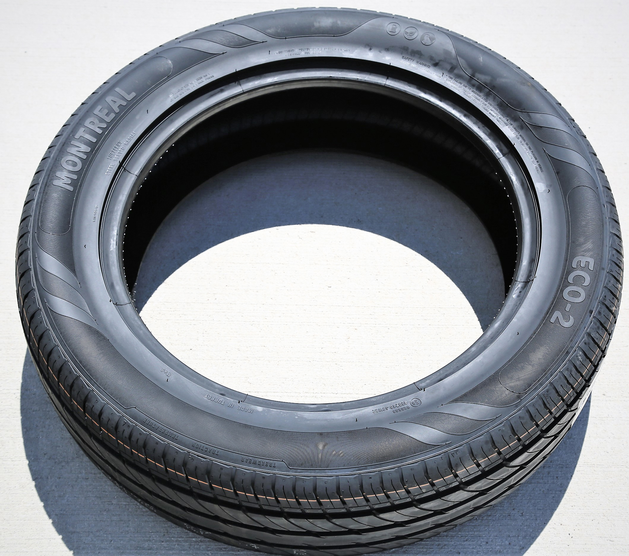 Montreal Eco-2. FEATURES AND BENEFITS: All Season Traction; Improved Controllability; Long Service Life; Eco Friendly Tire; . OVERVIEW: The Montreal Eco-2 is an all season, performance and high performance tire created for passenger cars and SUVs.The tire features an all season rubber compound mix with additional silica and polymer. These materials enhance its adaptivity, helping it maintain its flexibility throughout the year. It provides the same high performance in various temperatures, be it in wet, winter, or dry weather conditions. This model is an ideal choice for all season use, as it prevents heat build-up even during the hot summer temperatures. The detailed tread design provides a high number of biting edges with the lateral sipes and notches. Together with the grooves, they take care of hydroplaning prevention, channeling water and slush away from the footprint.This model maintains its maneuverability at high speed thanks to its tread pattern. Its asymmetric tread features a careful siping to improve stability and controllability. The five-rib tread design sits securely on the road surface with its flat footprint throughout the performance. This way, the tire's driving stability and steering responsiveness are significantly enhanced. The model boasts a strong structure and a wide tread, allowing the load and driving pressure to be evenly distributed. This prevents pressure buildup, which enables the tire to maximize its high speed performing power.Another advantage of the ribbed tread design is that it slows down the tread wear rate. Plus, it is made of a strong all season rubber compound that can endure plenty of traction in the long term. The tread is also asymmetric, which ensures stability and even distribution of driving pressure across the five ribs. Since all the pressure circulates evenly on the tread, it prevents irregular wear formations and extends service life. The silica and polymer in the compound help the tire keep the heat generated at bay during driving, preventing premature wear.The five-rib tread pattern plays a huge role in equalizing the load or driving pressure that gets applied to the tire. With a heat-resistant compound, even more pressure can be eased off the tread footprint. This results in a lower rolling resistance, which makes the tire eco-friendlier. It requires less fuel intake, which also means lower CO2 emission levels. This makes the Eco-2 an ideal choice for an environmentally friendly driving experience. Manufacturers recommend changing tires every 10 years. As long as tires are properly stored before they are sold, the year of their manufacture will not shorten their service life.
