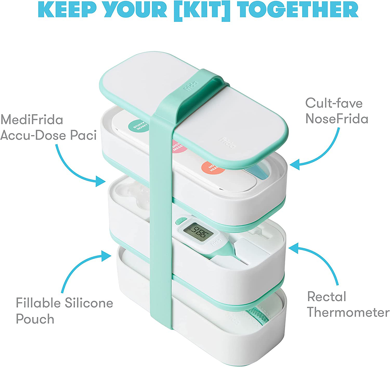We bento-ver backwards to create a Frida storage system that plays nicely in your drawers and in the diaper bag. Meet the Mobile Medicine Cabinet. Separate its layers in your nursery drawers to keep fuss-busting essentials easily accessible. When you're ready to take baby out on the town, pack it, stack it and strap it to keep everything together while on-the-go. We loaded it up with NoseFrida + Filters, MediFrida, Rectal Thermometer + a removable pouch so you're prepped for baby's snotty, under-the-weather moments no matter where they happen. Plus, the removable silicone pouch is perfect for storing baby meds or must-haves. PORTABLE: Drawer-to-diaper bag storage system for baby's wellness essentials; LOADED: Stocked with NoseFrida + filters, MediFrida, Rectal Thermometer + removable pouch; STACKED: Three layers with airtight lids that stack in any order; ADJUSTABLE: Carry two or three layers together while on-the-go with the silicone strap; HANDLED: Silicone carrying strap for easier portability;.
