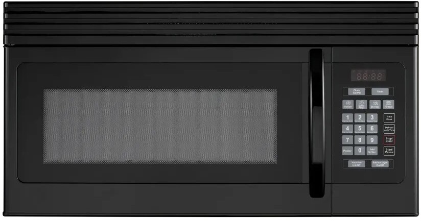 1.6 cu. ft. Over-the-Range Microwave Oven with 1,000 Watts, 2-Speed 300 CFM Venting System, Sensor Cook, Time & Weight Defrost, Interior Light, and Glass Turntable: Black. Trust the power of 1,000 watts for fast and consistent cooking, defrosting, and reheating. Enjoy delicious, evenly cooked meals every time you use your microwave. From quick snacks to elaborate dishes, this microwave handles it all with ease. Provide precise control for a variety of cooking tasks, ensuring optimal results for everything from defrosting to full-power cooking. Quickly clears smoke, steam, and odors from your kitchen, keeping the air fresh while you cook. The defrost feature lets you thaw frozen foods quickly and efficiently, ensuring that your ingredients retain their taste and quality. No matter if it's meat, poultry, or any frozen dish, the microwave takes the guesswork out of the defrosting process. Stay in control of your cooking times with the integrated timer. Whether you're following a recipe or need a gentle reminder when reheating, this feature ensures your dishes are cooked to perfection and your schedule stays on track. Helps keep little hands safe by preventing accidental operation of the microwave. Illuminate your culinary creations with the warm glow of the incandescent interior light. Not only will it provide you with a clear view of your dishes as they cook, but it also adds a touch of coziness to your kitchen atmosphere. It includes a handy surface light that illuminates your stovetop for a well-lit cooking area. The 13.6-inch turntable guarantees even cooking. Whether it's a large platter or multiple items, this microwave's turntable handles it all. No more cold spots or hot spots, just perfectly prepared dishes every time. 1-year manufacturer's limited warranty with purchase, or 2-year limited warranty with product registration within 90 days of purchase. Sensor Cook. Add 30 Seconds. Clock. Eco Mode. UL Certified. Total Capacity: 1.6 cu. ft. Interior Light Type: Incandescent. Cooktop Light Type: Incandescent. Eco Mode: Yes. Door Swing: Left. Convenience Cooking Controls: Yes. Add 30 Seconds: Yes. Rack: No. Convection: No. Defrost Time: Yes. Defrost Weight: Yes. Turntable: Yes. Turntable Size: 13.6". Exhaust Fan Speeds: 2. Venting Type: Front, Top, Back. Vent Air Flow (CFM): 300. Filtration: Yes. Control Type: Membrane. Power Levels: 10. Child Lock: Yes. Clock: Yes. Timer: Yes. Sensor Cook: Yes. Start Button: Yes. Stop/Cancel Button: Yes. Sound On/Off: No. Turntable On/Off: No. Volts: 120V. Amps: 15. Microwave Watts (Output): 1,000W. Product (W x D x H): 29 29/32" x 15" x 16 13/32". Cavity (W x D x H): 20 13/64" x 14 1/2" x 9 19/64". Product Weight: 55.1 lbs. Shipping Weight: 62.8 lbs. UL Certified: Yes.