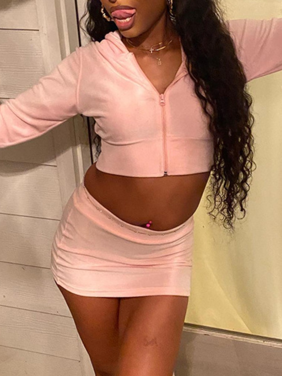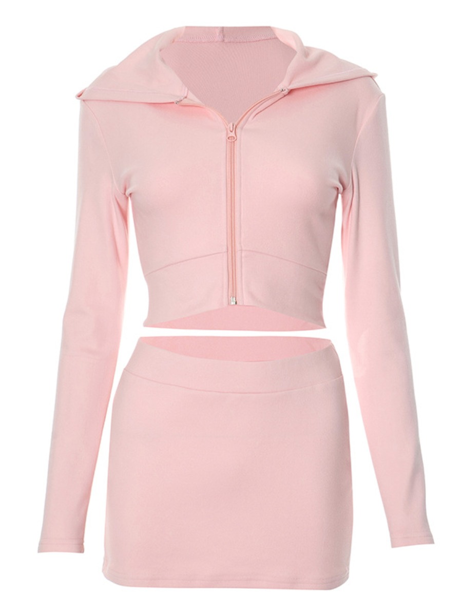 LW BASICS Casual Polyester Hooded Collar Zipper Design Solid Color Long Sleeve Two-piece Skirt Set.