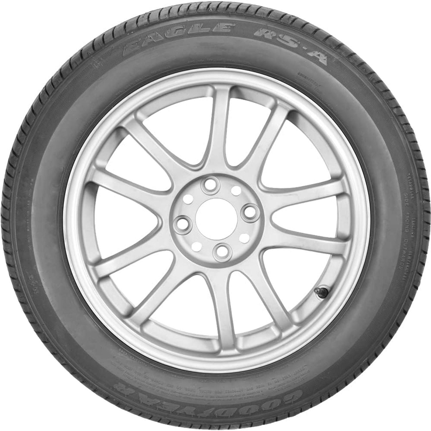 Goodyear Eagle RS-A (OE). FEATURES AND BENEFITS: Reduced road noise; High speed durability; Precise steering responsiveness; Increased cornering ability; Great all weather traction; Hydroplaning resistance; . OVERVIEW: The Goodyear Eagle RS-A (OE) is an all season high performance highway tread tire made for passenger and SUV vehicles. This is the original equipment tire of select vehicle models.This tire has superb traction in dry, wet and winter weather. The unique tread pattern helps maintain an equal road grip in all weather conditions, making the tire safer to use. The sipes in the tread pattern help maintain the tire's grip through varying road conditions, while the circumferential grooves eliminate water from beneath the footprint. The dispersion of water enables the tire to resist dangerous hydroplaning.The asymmetric tread pattern enhances the tire's steering responsiveness. The precise steering responsiveness makes this model easier to control in all weather. The better handling allows the driver to respond quickly to any arising situations during the drive. The shoulder tread pattern provides additional biting edges, increasing its cornering ability, grip and power. All of these improvements offer a safer driving experience.The reinforced steel belts in the tire's structure provide greater high speed durability. This enhances the tire's performing ability, allowing better high speed stability and safety.The Eagle RS-A (OE) also offers a quiet and comfortable drive. The special tread pattern increases the road-to-tire contact, which gives a larger area for the soundwaves to travel through. The soundwaves are guided through the tread grooves in a way that reduces the road noise heard in the cabin of the vehicle. Manufacturers recommend changing tires every 10 years. As long as tires are properly stored before they are sold, the year of their manufacture will not shorten their service life.