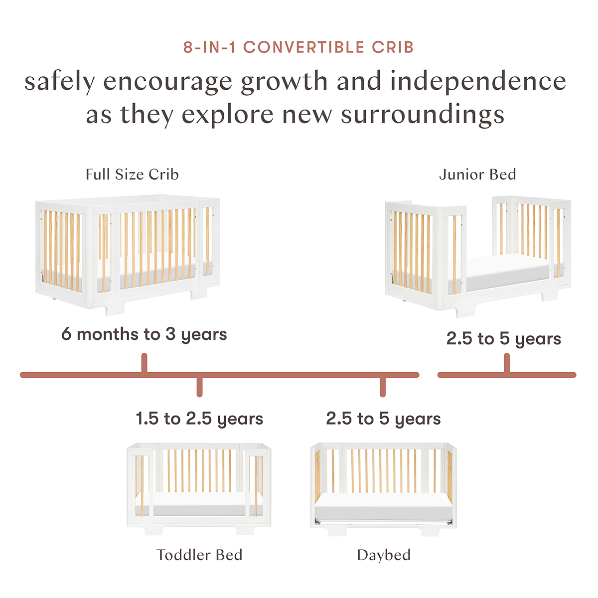 Introducing the Yuzu Crib by Babyletto, the perfect solution for growing families seeking versatility and style in their nursery. With its unique all-stages 8-in-1 convertibility, this crib adapts to your child's needs as they grow, transitioning seamlessly from a bassinet to a midi size and eventually to a standard full-size crib and junior bed. Its sleek geometric design and rounded edges make Yuzu a modern statement piece that complements any nursery decor. The hidden hardware construction ensures a polished, clean look, while the low-profile design allows for easy access to your sleeping baby. Safety and sustainability are at the core of the Yuzu Crib's design. Crafted from sustainably sourced New Zealand pine wood, one of the most renewable woods available, this crib is consciously crafted with your baby's well-being in mind. It surpasses ASTM International and U.S. CPSC safety standards, offering peace of mind to parents. The Yuzu Crib is also GREENGUARD GOLD certified, having undergone rigorous scientific testing for over 10,000 chemical emissions and VOCs. This certification ensures cleaner indoor air quality, creating a healthier environment for your baby to sleep, play, and grow. Convenience and adjustability are key features of the Yuzu Crib. Equipped with removable locking caster wheels, this crib can be easily moved from room to room, providing flexibility in your space. For safe co-sleeping, the bassinet and midi stages offer adjustable height options. Additionally, the Yuzu Crib comes with everything you need to convert between different stages, including all necessary hardware and parts, as well as a 1" bassinet pad and a custom 2" midi pad. Create the perfect nursery for your little one with the Yuzu Crib by Babyletto. Features: Grows with your child and adapts to your space; Versatile modern design with a sleek geometric form and rounded edges; All-stages 8-in-1 convertibility with 8 different configurations: bassinet, midi crib, midi toddler bed, midi daybed, full-size crib, full toddler bed, full daybed, and junior bed; Portable and adjustable height with removable locking caster wheels; Thoughtfully crafted with sustainably sourced New Zealand pine wood; Safe for babies with non-toxic finishes and compliance with safety standards; GreenGuard Gold certified for low chemical emissions; Includes all necessary hardware and parts for conversion, except the full-size mattress; Full-size mattress and sheets sold separately; Recommended Babyletto 4" Pure Core Midi Crib Mattress for extra support in the midi stage.; Specifications DIMENSIONS: Bassinet: 29.75" L x 19.75" W x 30.75" H; Midi crib, midi toddler, midi daybed: 37.5" L x 29.75" W x 30.75" H; Crib, toddler bed, daybed, junior bed: 53.8" L x 29.8" W x 32.6" H; ; SUITABILITY: From birth up to 50 lbs; PRODUCT WEIGHT: 86 lbs;.