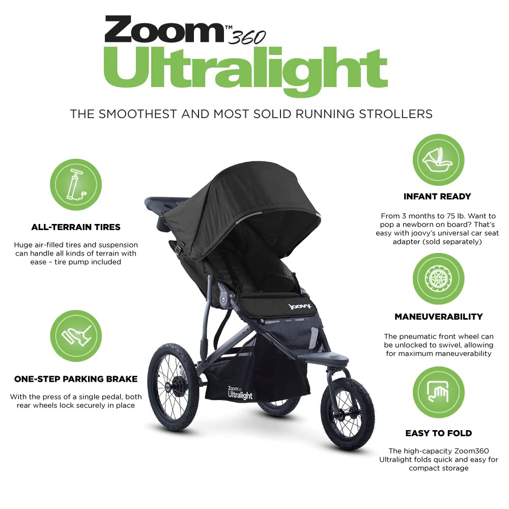 Enjoy an active lifestyle and want to jog or run with your little one? Introducing the Zoom360 Ultralight Lightweight Performance Jogging Single Stroller, one of the smoothest and most solid running strollers around it boasts state-of-the-art features to help you cover more miles over tricky terrain. Some of its standout qualities include large, top-quality, pneumatic wheels, a peek-a-boo window so they never feel far away, and a large canopy to keep them protected from the sun's glare. But weighing just 26.25 lbs, it's the unbelievable lightness of this product that really makes it stand out from the rest. You'll feel like you can jog forever and go anywhere, and the suspension on this running stroller will carry you and your precious bundle of joy smoothly over rugged landscapes wherever you choose to take it. Other great aspects of this featherweight jogging stroller include: A high riding seat so your child can take in the world around them; Shock absorbing suspension; A weight of just 26.25 lbs; Locking and swiveling front tires for stability and maneuverability; Extra-large air-filled tires; Easy to fold; An included parent organizer to keep essentials close at hand; Included air pump; One-step linked parking brakes; Meets Disneyland / Disney World stroller size requirements (front wheel needs to be in un-locked mode); Suitable for children 3 months to 75 lbs also newborn-ready with car seat adapter (car seat adapters sold separately); Combining Comfort and Quality Some of the best running strollers are made from high-quality materials, with intuitive design details, and the Zoom360's certainly no exception. The impeccably-designed running stroller enables you to keep up your fitness with no need to reach out to a babysitter. Go the Distance, Whatever the Weather Run all year long, in any weather, and rest assured that your youngster's super safe under the Zoom360's sun-safe, weather-resistant canopy. Glaring sunshine, pouring rain, bracing wind this running stroller can take it all. Upright Seat for Inquisitive Little Ones With a practically upright seat, your child can watch the world go by and stay entertained perfect for babies who enjoy people watching or being generally nosey! Ready to Take on the Most Rugged of Terrains The best jogging stroller for runners would be one that's geared up for every type of terrain, from grass to gravel and the Zoom360's indisputably up for the challenge. Its amply-sized,air-filled wheels handle all kinds of surfaces, like rickety old paths, bumpy beaches, and cobblestone walkways. Keep an Eye on Your Baby While You're Jogging A canopy's a must-have in any jogging stroller buggy, particularly in glaring sunlight. Happily, the Zoom360 sports a clear plastic peek-a-boo window, so you can keep an eye on your precious little one while you're running. It's also useful for those much-loved games of peek-a-boo! Keep Keys, Phones, and Drinks Organized The jogging stroller features a handy zippered pocket for all those essentials, whether it be keys, smartphones, and beverages. (Included) Intuitive One-Step Linked Parking Brakes Your stroller stays solidly where it should, whether it's in use or not, thanks to the spring-loaded brake mechanism. Just press on the single pedal to lock both rear wheels of your Zoom360. Simple, Stylish Storage Whether you use the storage basket to keep diaper bags, snacks, toys, or grocery bags, you can keep it all within the Zoom360's unique, functional and beautiful basket. Specifications Assembled dimensions: 54 x 25 x 46 in (L W H front wheel locked); Assembled dimensions: 49 x 25 x 46 in (L W H front wheel un-locked); Folded dimensions: 34 x 25 x 19 in (L W H); Product Weight: 25.7 lbs.; Min. Age: 3 months (or newborn with Car Seat Adapter); Max. Weight: 75 lbs.;.