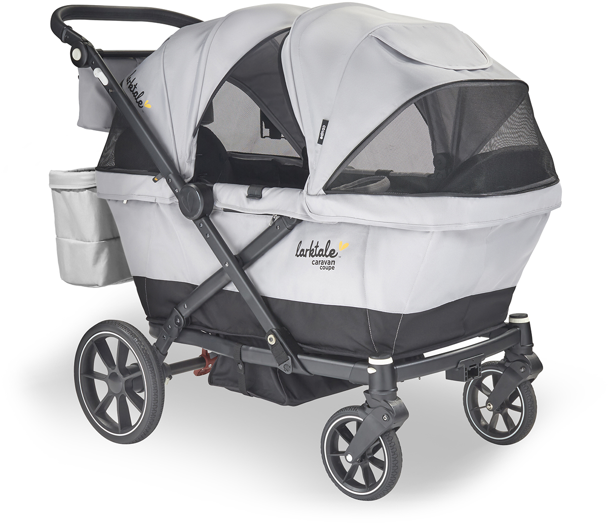 The Larktale caravan coupe V2 offers all the features of a large stroller/wagon, in a more nimble and compact package with an impressively small fold, all while maintaining the comfortable seating and higher weight capacity you crave for your growing kiddos. The V2 version includes a new storage basket that can be attached to either the front or the rear of the wagon and features a no-rethread harness system. Suitable for children from 6 months to 65 lbs per seat, the caravan coupe will comfortably seat up to two growing kids in individually reclining seats and a shared drop-down footwell for comfortable stroller-style seating. If you need space to haul cargo or let your little ones stretch their legs, you can securely invert the footwell to create a flat base interior to suit your needs. No tools are needed to complete the transition, making it easy for parents to change their strolling style on the fly. Parents will also love the dual adjustable sun canopies with air-flow panel and peek-a-boo window, seat recline, height-adjustable leatherette handlebar, included stroller organizer and self-leveling cup holder, and the all-wheel suspension system. While the seats are intended for children 6 months and older, a car seat adapter is available to accommodate a newborn (sold separately. The impressively compact fold of the caravan coupe is a game changer for families that want a stroller/wagon but are short on vehicle trunk space, or storage space in their homes. Features Suitable from 6 months to 65 lbs per seat and 147 lbs total weight capacity including cargo.; Compact design without compromising on features!; Quick and easy fold that tucks the rear wheels inwards for an unexpectedly compact folded footprint. Clipthe fold lock to keep the frame folded for transportation or storage.; Dual multi-position sun canopies each feature a zippered canopy extension with airflow panel, and a peek-a-boo window.; An adjustable handlebar with leatherette grip provides a comfortable push for users of varying heights.; Seats can be reclined individually for each passenger's comfort.; The large storage basket can be attached to either the front or the rear of the wagon.; Drop-down footwell allows children a more natural seating position.; Adaptable interior allows you to securely invert the footwell to create a flat seating position for cargo or tolet passengers stretch their legs.; Handlebar console with multiple storage compartments for drinks and personal items.; Storage console for snacks and toys can be mounted between the seats or on the exterior of the wagon.; Four mesh interior pockets keep your child's snacks and toys within their reach.; Exterior seat back mesh pocket to store on-the-go essentials.; Large non-flat rubber wheels and an all-wheel suspension system provide a smooth and comfortable ride.; Lockable swivel front wheels provide extra stability on uneven terrain.; No-rethread padded safety harnesses offer easy height adjustments and keep seated children secure.; Self-leveling cup holder included.; Clear-view non-fogging deluxe rain cover included.; Safely attach an infant car seat using a caravan coupe car seat adapter (sold separately); Spot clean or remove fabric completely to hand-wash in mild detergent. Replace fabric on frame to air drycompletely before use after washing.; Specifications Age Range: Suitable from 6 months up to 65 lbs per seat; Total Weight Capacity: 147 lbs; Newborn Options: Car Seat Adapter available for Maxi Cosi, Clek and Nuna infant seats; Assembled Dimensions: 49.5 x 25 x 42.5 inches; Folded Dimensions: 15 x 25 x 38 inches; Assembled Product Weight: 39.8 lbs; Adjustable Handlebar Range: 28 43 inches; Packaged Dimensions: 22.5 x 11.5 x 37.5 inches; Packaged Weight: 54.1 lbs; What's In The Box Stroller/Wagon Chassis; Sun Canopies; Stroller Organizer; Storage Console; Storage Basket; Cup Holder; Rain Cover;.