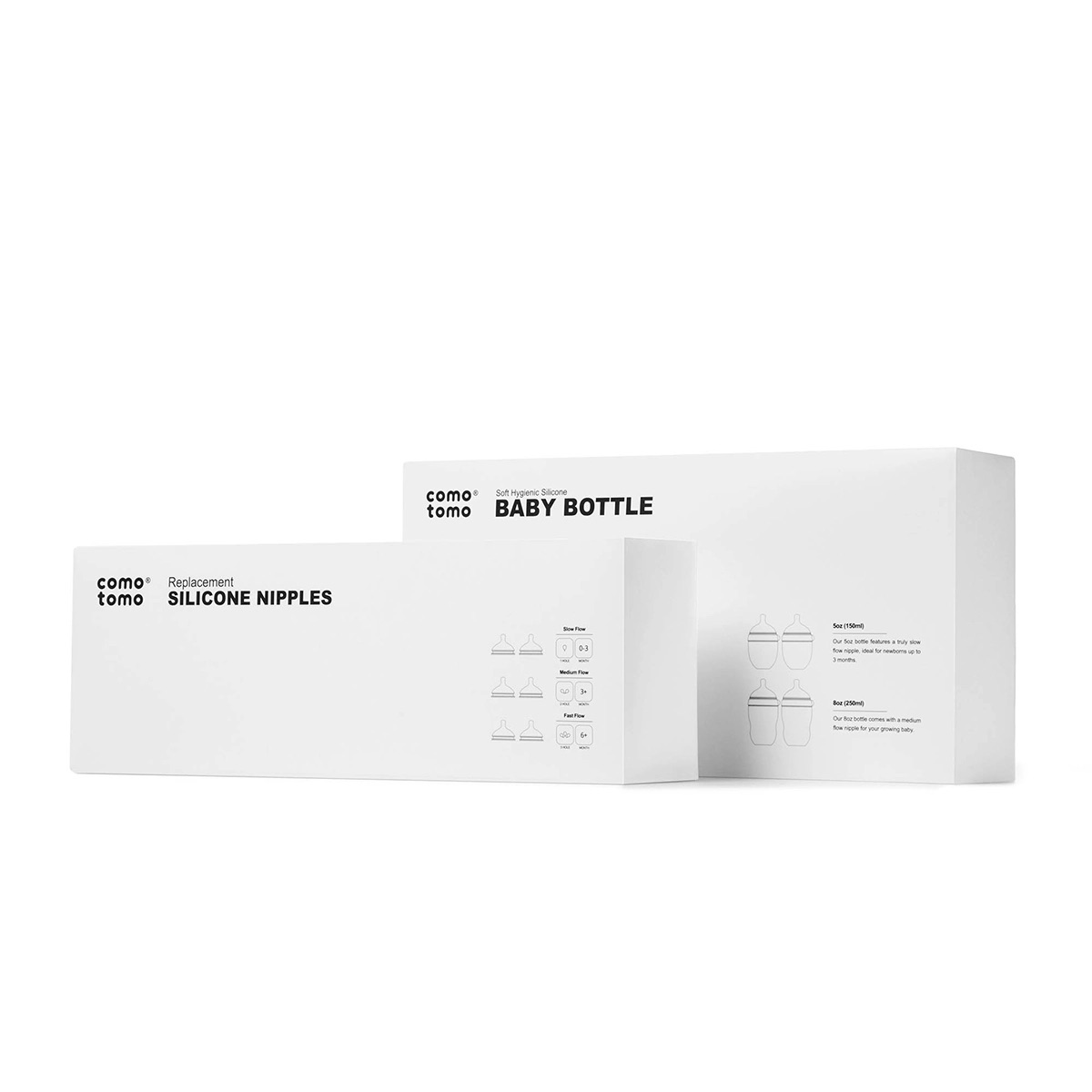 Comotomo Baby Bottle Bundle (7-piece Set) is the perfect gift for expecting or new parents. Our beloved bottles feature an innovative and sensible design to most closely mimic breastfeeding - making building your registry or gifting the right bottles a breeze!Comotomo Baby Bottle Bundle includes:2 x 5oz Bottles2 x 8oz Bottles1 Pack (2 units) x Slow Flow Nipples (0-3 months)1 Pack (2 units) x Medium Flow Nipples (3-6 months)1 Pack (2 units) x Fast Flow Nipples (6+ Months) Designed to mimic breastfeeding to reduce bottle rejection and nipple confusion.; Built-in dual anti-colic vents provide consistent milk flow without the unwanted air-intake to prevent colic.; Made with high quality, food contact grade silicone for safe feeding, free from chemicals such as BPA, PVC, and Phthalates.; Truly wide-neck design makes it easy to clean the bottles by hand without a brush.; Safe to clean in dishwashers (top rack), as well as microwave, steam, and electric sterilizers.; 5oz bottles come with Slow Flow nipples (0-3 months), and 8oz bottles come with Medium Flow nipples (3-6 months). Faster flow available separately.; Compatible with most warmers and sterilizers in the market.;.